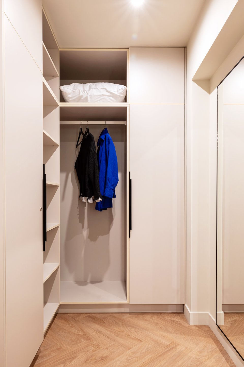 Гардеробная зона разделена на две части: одна предназначена для гостей, другая — для хранения запасных одеял и подушек в закрытом шкафу.