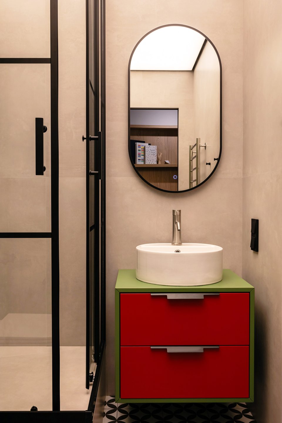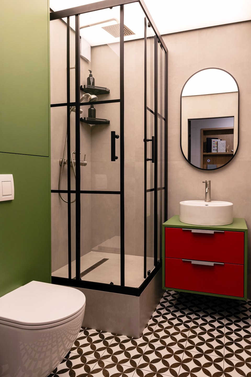 В санузле для отделки использованы геометричная плитка на полу, бежевый керамогранит на стенах и зеленые мебельные панели. Дизайнер отмечает, что пространство выглядит, как «арбуз на пляже»: с нейтральным фоном и яркой мебелью. Для хранения предусмотрены тумба под раковину и шкафчик над унитазом. На потолке расположено светящееся полотно, которое визуально увеличивает пространство.