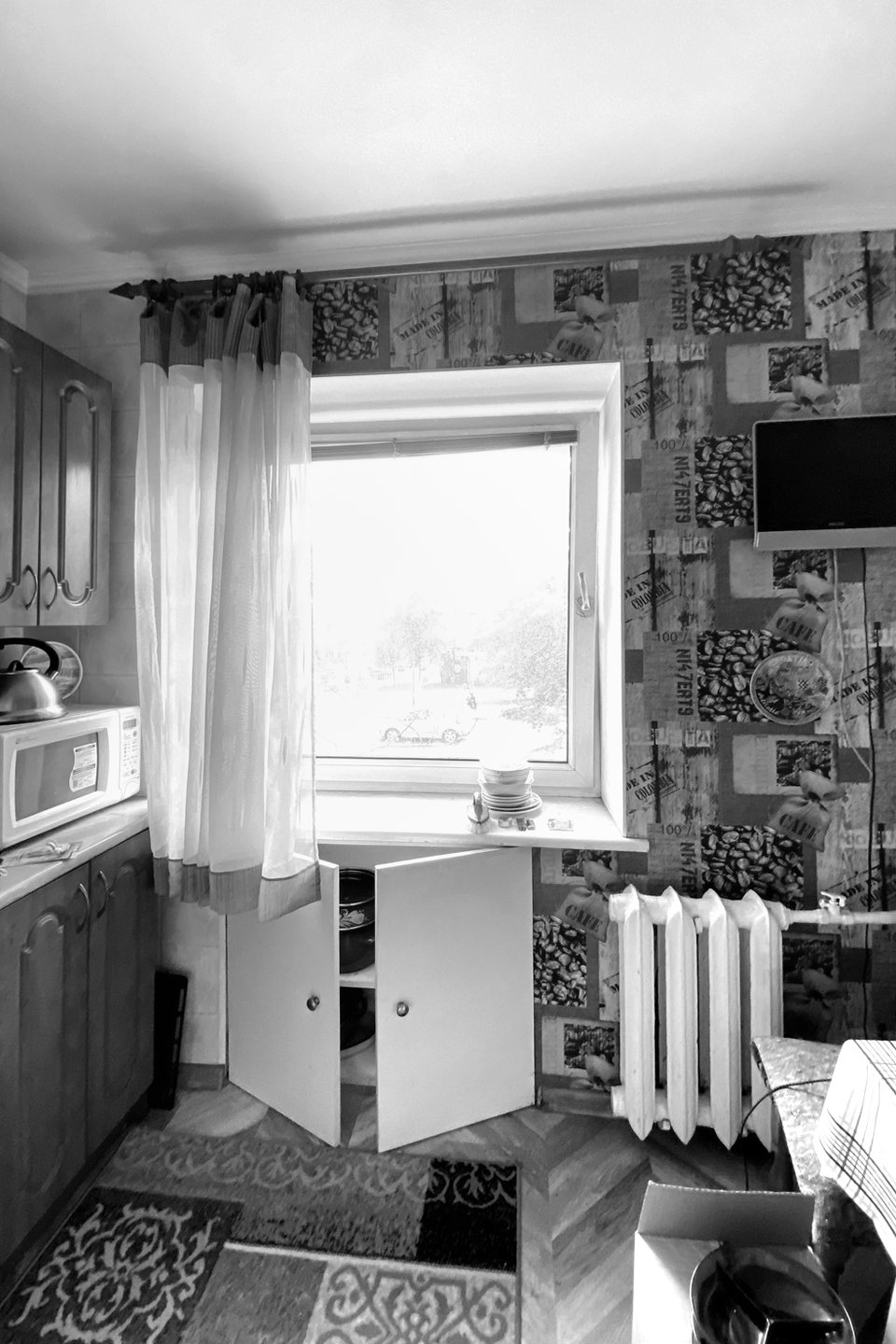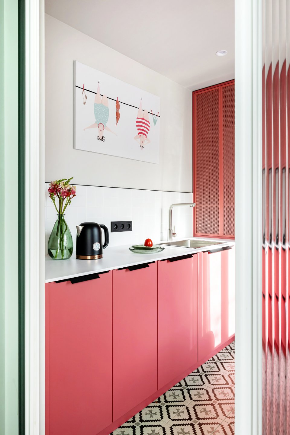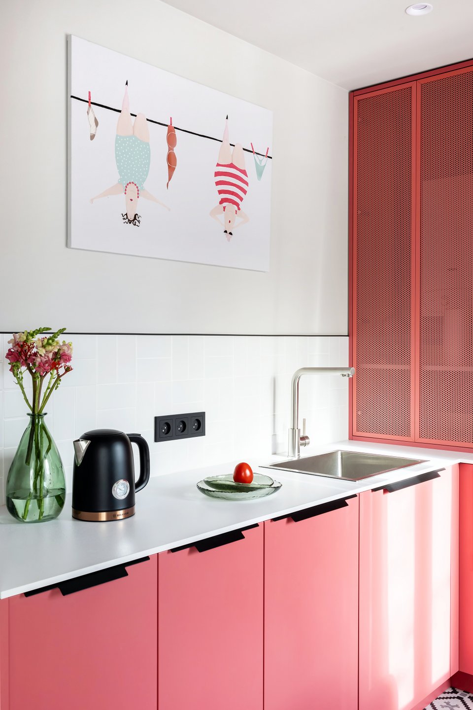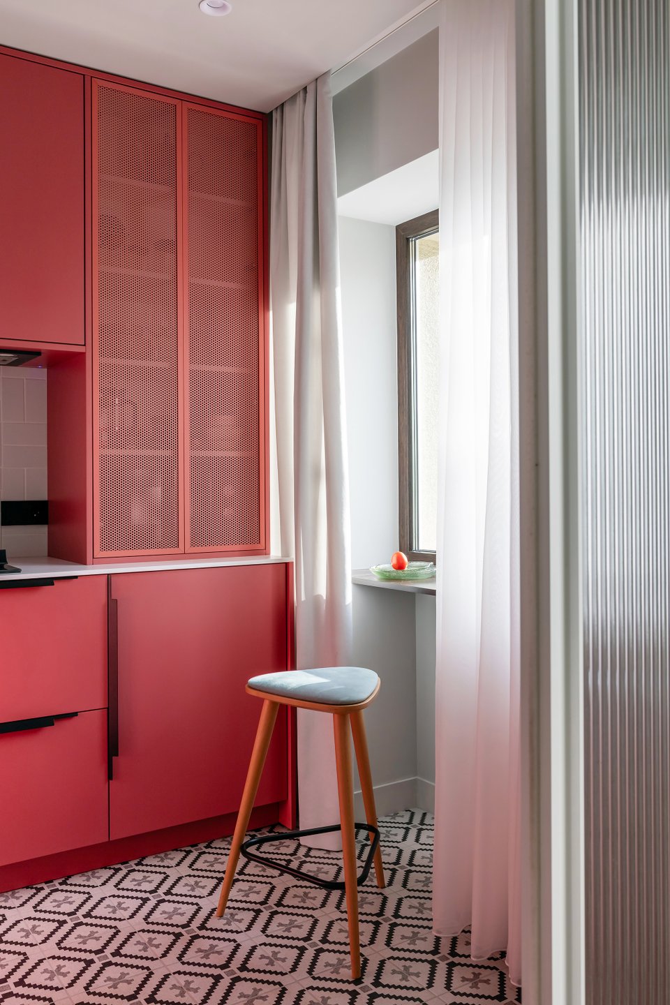 Кухня — самая яркая часть квартиры, напоминающая шкатулку. Гарнитур изготовили на заказ. Фасады верхнего яруса — перфорированные, изготовлены из металла. Наполнение кухни продумано до мелочей: здесь есть встроенный холодильник под столешницей, газовая варочная поверхность, вытяжка и посудомоечная машина. За одним из нижних фасадов скрыта стиральная машинка. Подоконник выполняет роль барной стойки для завтраков и перекусов.