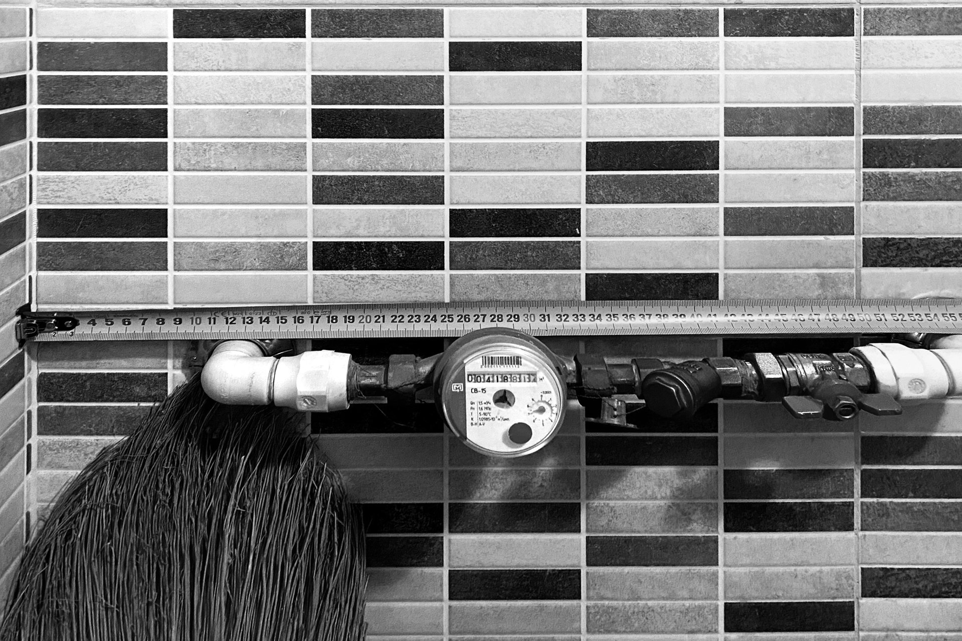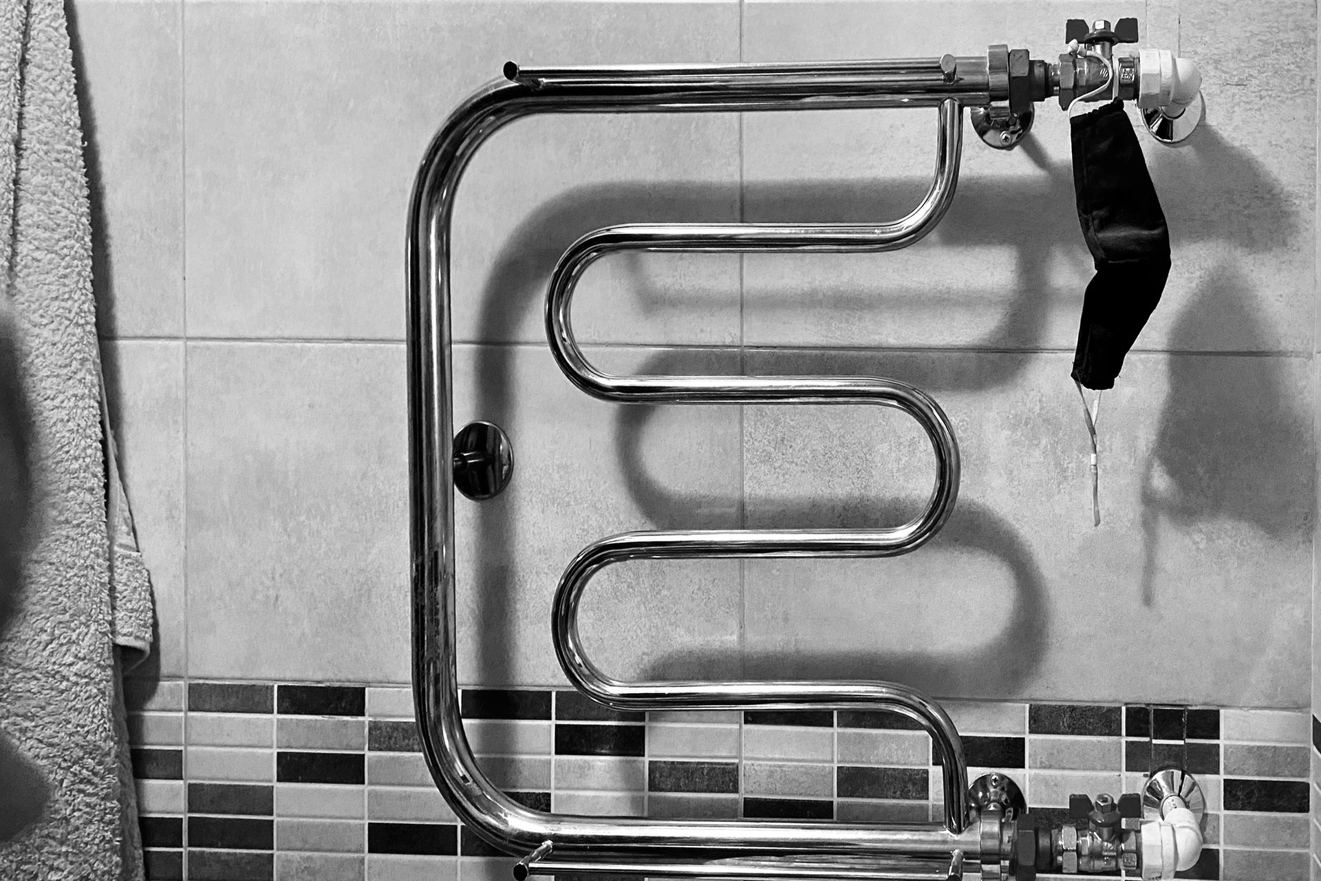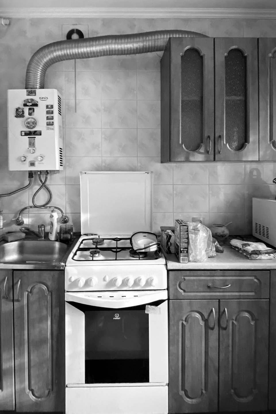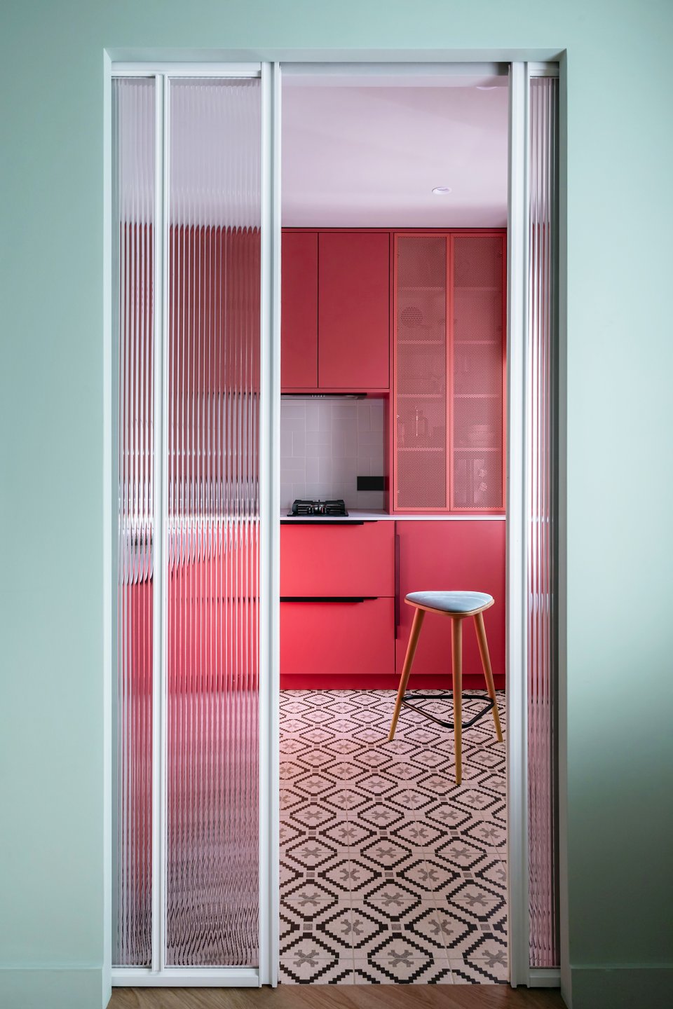 Кухня — самая яркая часть квартиры, напоминающая шкатулку. Гарнитур изготовили на заказ. Фасады верхнего яруса — перфорированные, изготовлены из металла. Наполнение кухни продумано до мелочей: здесь есть встроенный холодильник под столешницей, газовая варочная поверхность, вытяжка и посудомоечная машина. За одним из нижних фасадов скрыта стиральная машинка. Подоконник выполняет роль барной стойки для завтраков и перекусов.