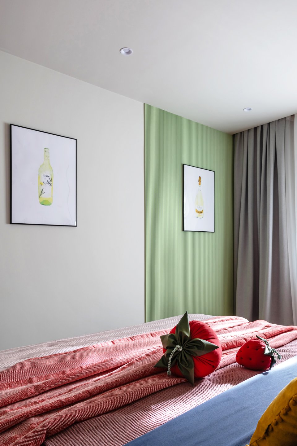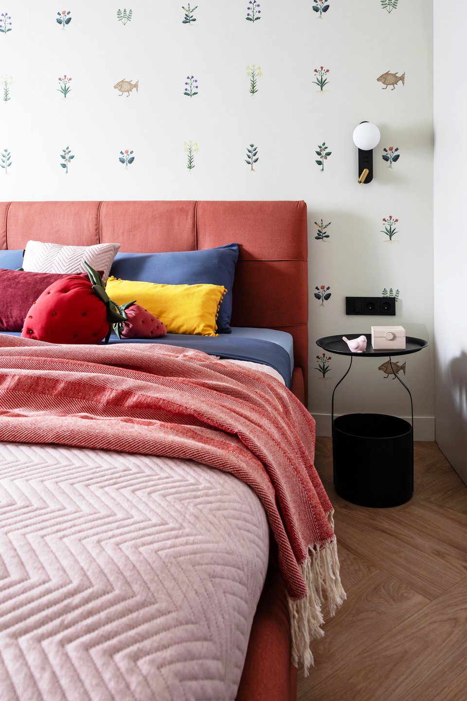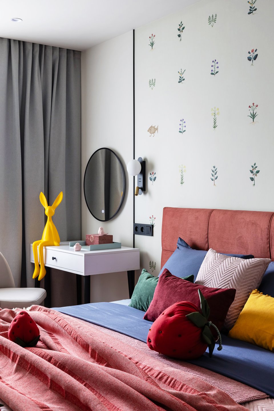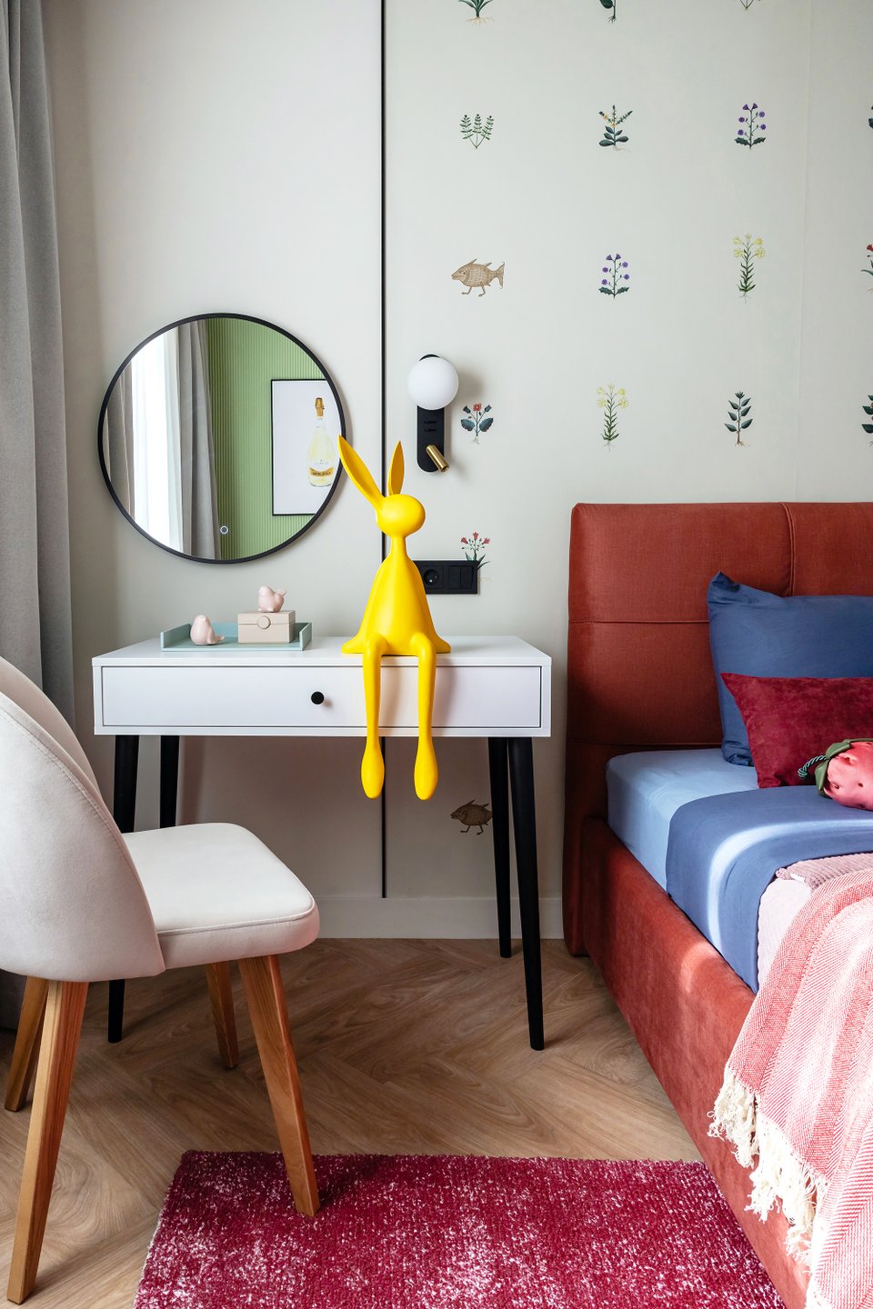 В спальне светлые стены «разбавили» обоями с рисунком цветов и рыб с ножками в области изголовья кровати. Часть стены напротив оформили декоративными панелями, окрашенными в зеленый цвет. Комната оснащена кроватью с матрасом шириной 180 см и туалетным столиком. Освещение — верхние светильники и прикроватные бра с ридерами для уютного вечернего света.