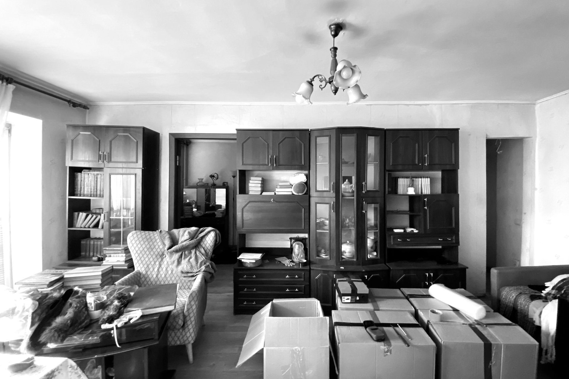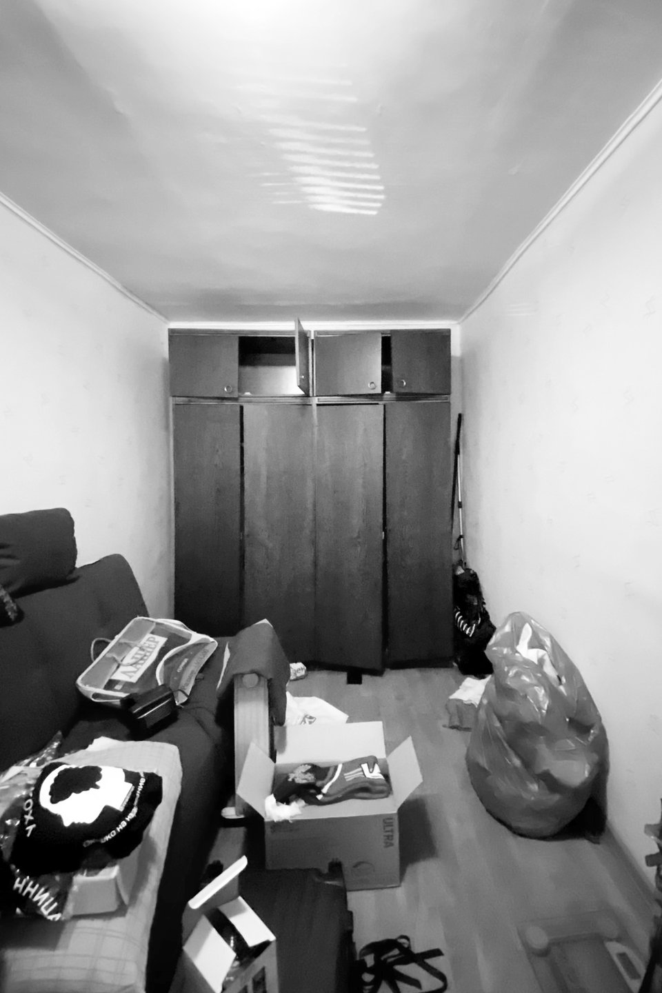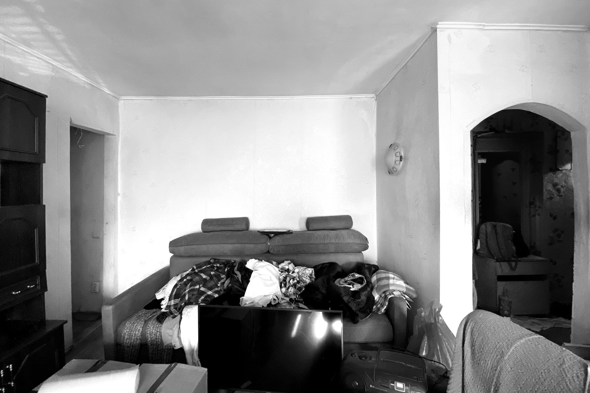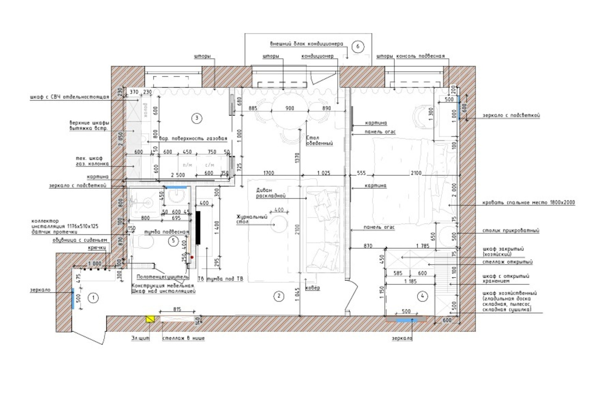 До ремонта это была типовая двушка в хрущевке с проходной комнатой и маленькой кухней. В квартире сделали перепланировку: кухню объединили с гостиной и перенесли вход на кухню (теперь попасть в нее можно из гостиной), предусмотрев перегородку с раздвижной дверью, так как в квартире проведен газ. Дверь в спальню также перенесли для удобного прохода. Из кладовки сделали гардеробную, увеличив ее за счет спальни.