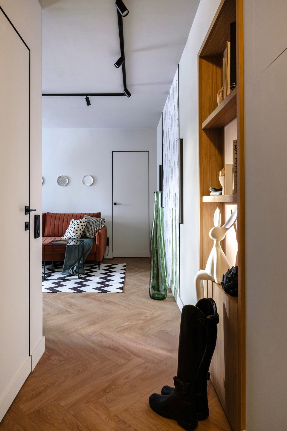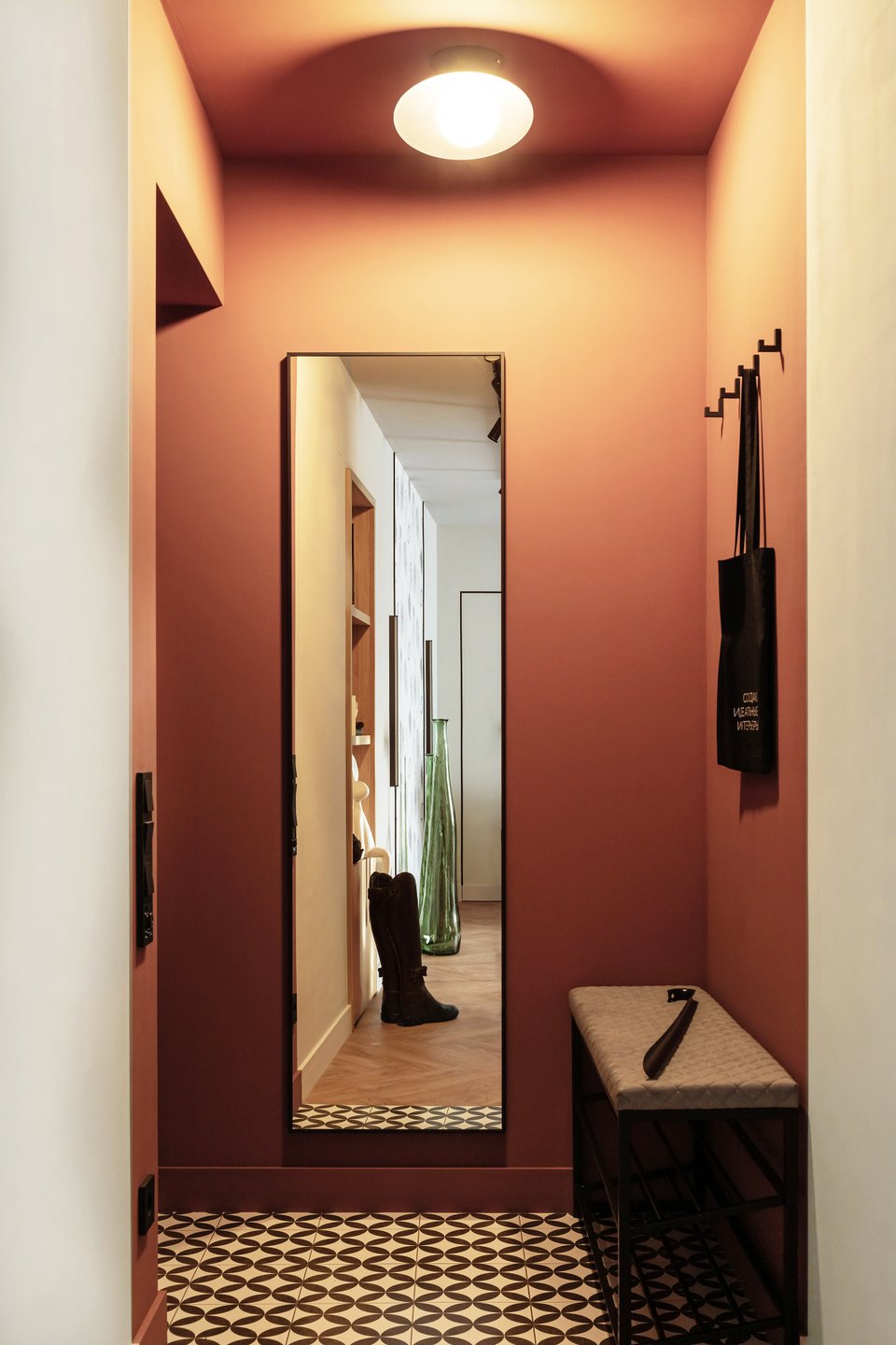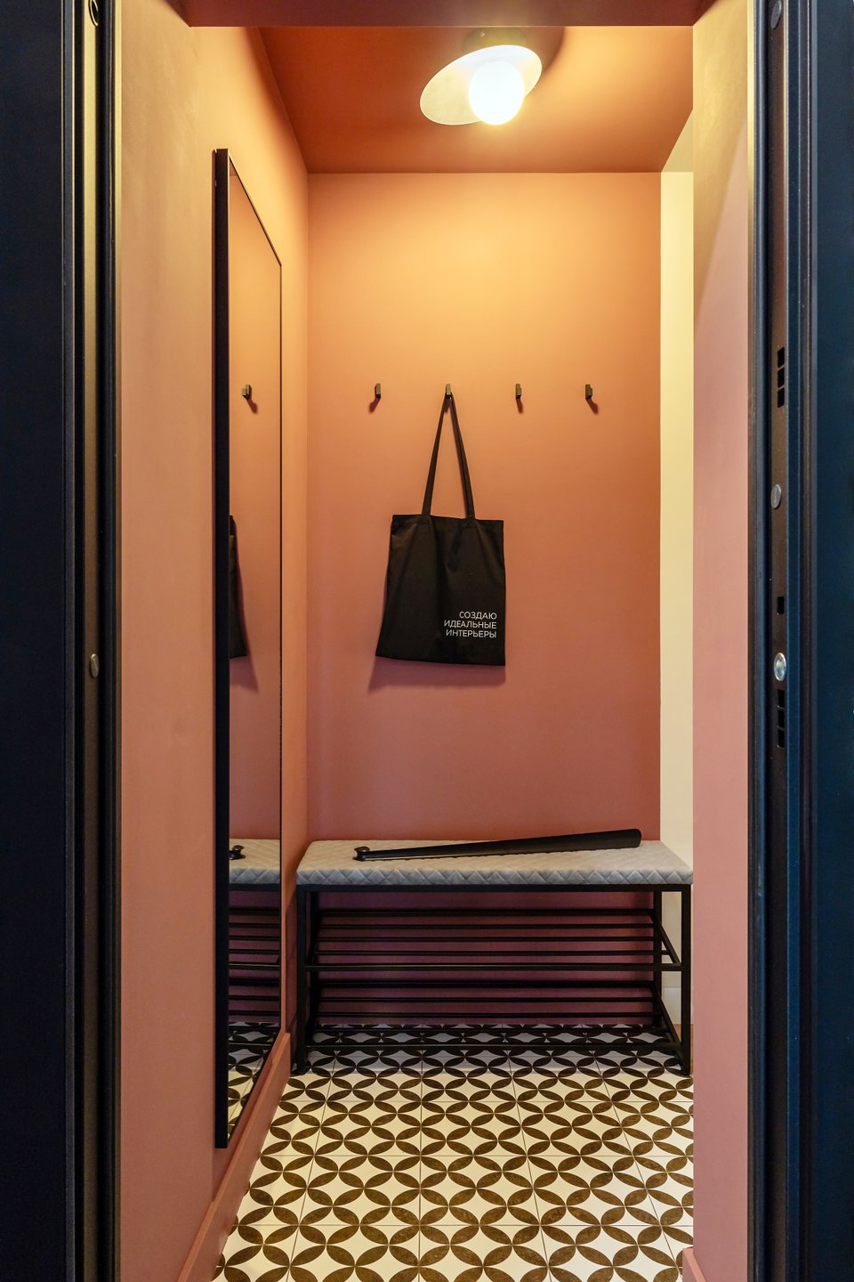 В прихожей стены и потолок окрашены в терракотовый, на пол уложена плитка с ритмичным рисунком. В зоне входа установлены крючки для верхней одежды и обувница, далее находится ниша, в которую встроили стеллаж.