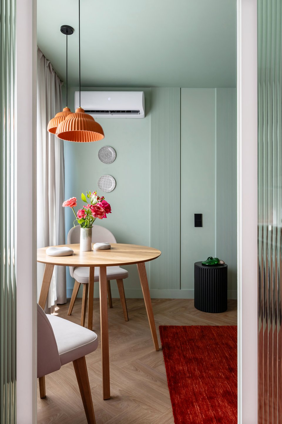 Обратите внимание: в интерьере дизайнер использовала прием колор-блок. Стены (включая рельефные панели) и потолок в зоне столовой окрашены в нежный бирюзовый. На стене напротив окна наклеены обои с медузами.