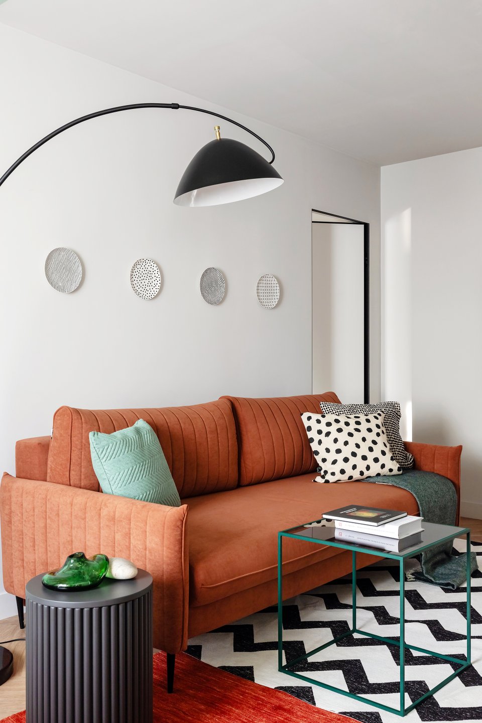 В гостиной стоит раскладной диван Сваут от divan.ru. Он привлекает внимание яркой обивкой и стильным дизайном. Дополнительный бонус — возможность трансформации в дополнительное спальное место.