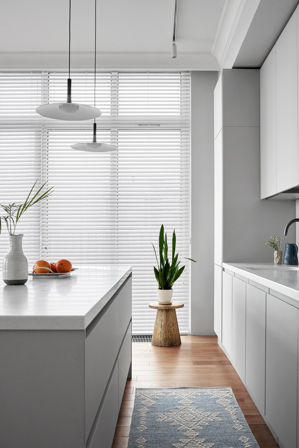 Фасады в цвете года 2026 «облачный танцор» выглядят чисто и современно. Они хорошо сочетаются с оттенками теплого дерева или темного камня и легко миксуются с блестящими поверхностями и яркими точечными акцентами (такими, как латунный фартук на примере ниже).