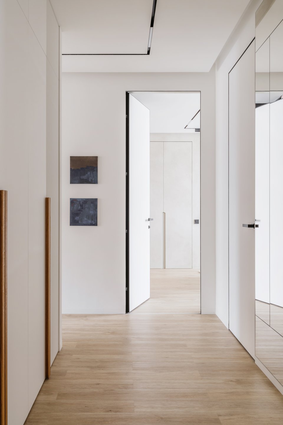 В небольшой или темной входной зоне Cloud Dancer, выбранный Pantone цветом 2026 года, творит чудеса. Он отражает свет и зрительно «раздвигает» стены. А если добавить зеркала в массивных рамах и светильники с теплым светом, то даже небольшой коридор станет светлым welcoming-пространством.