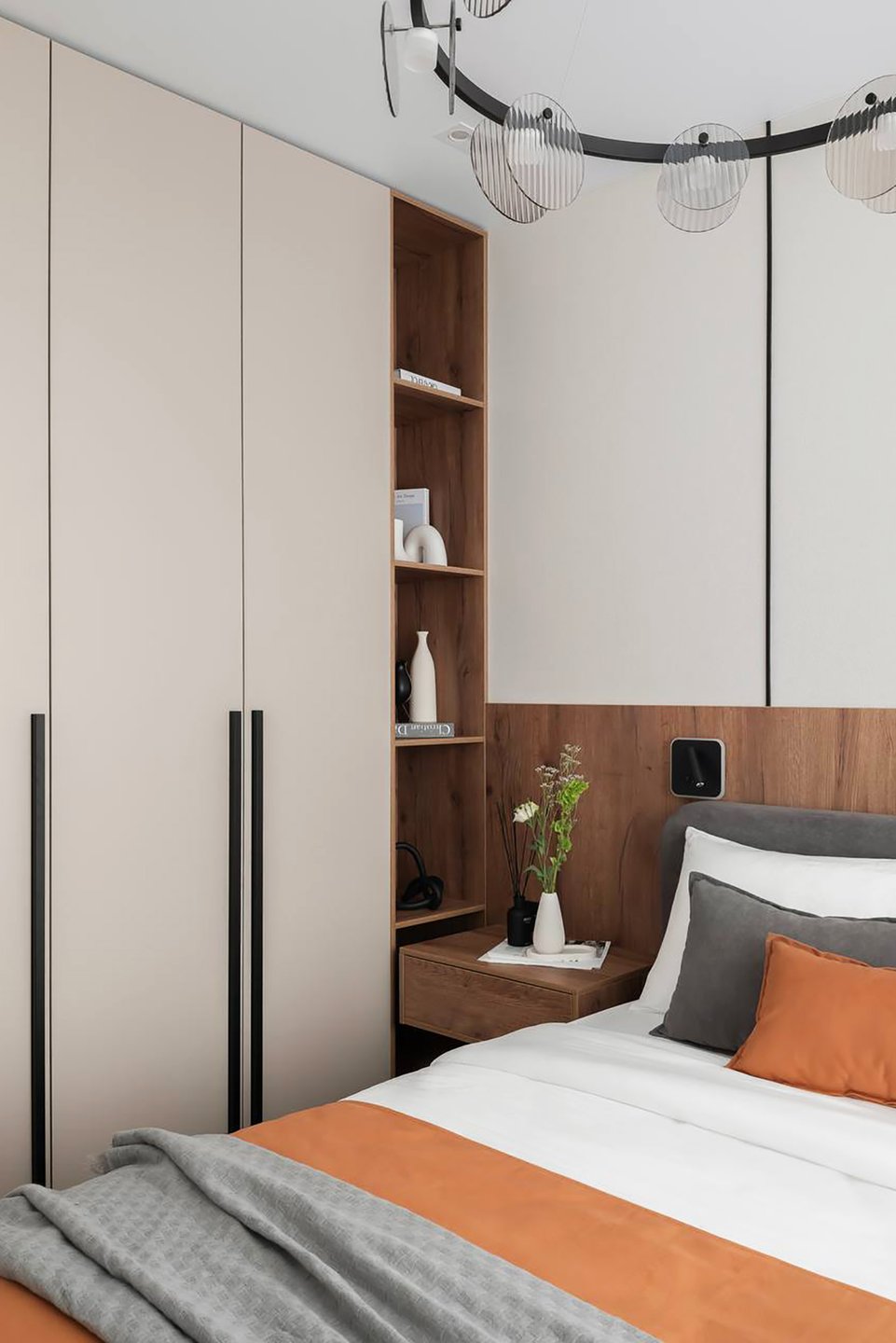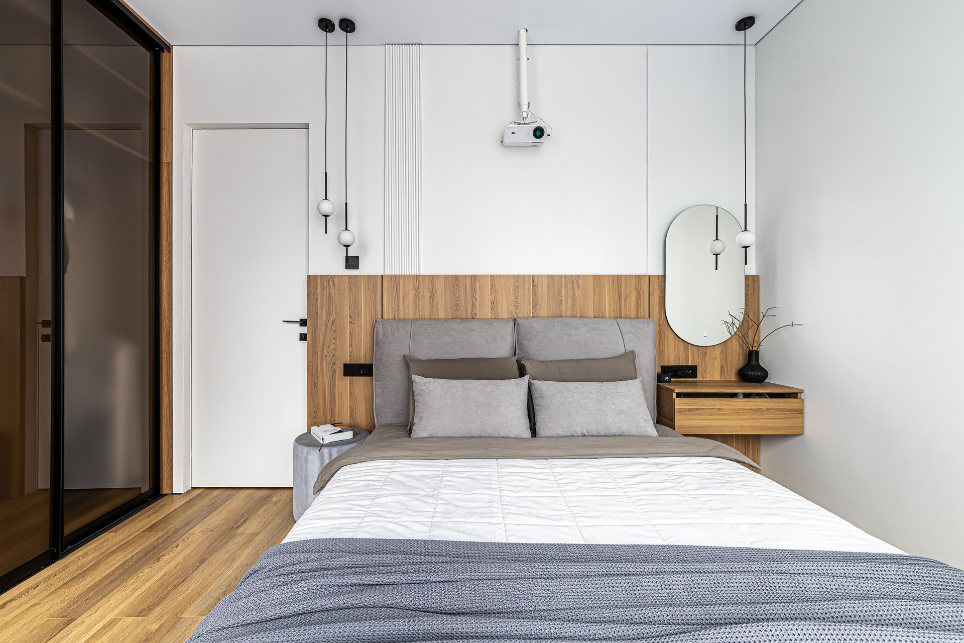 Атмосфера располагает к расслаблению. Доминанта — низкая кровать с лаконичным изголовьем — деревянным или обитым тканью. По сторонам — пара стильных бра или подвесов. Системы хранения обычно скрыты либо подобраны в цвет отделки стен.