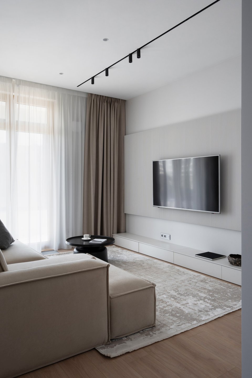 - На фото 4: трешка 85 кв.м, ЖК «Гармония». В кадре диван прямой Льери Мини от divan.ru. Дизайнер: Виктория Грузинова; фотограф: Екатерина Самойлович