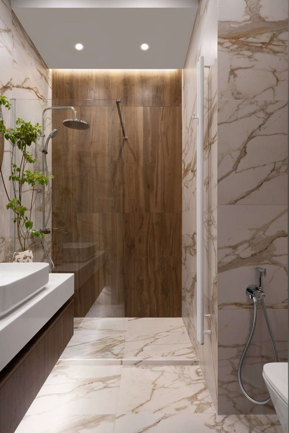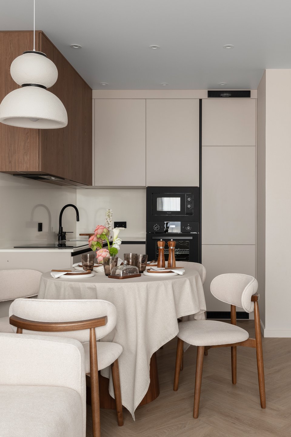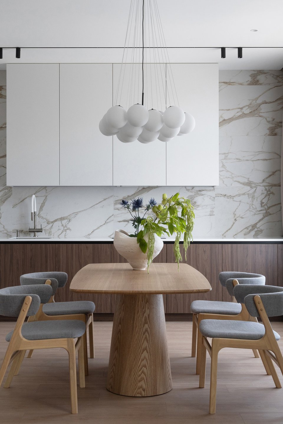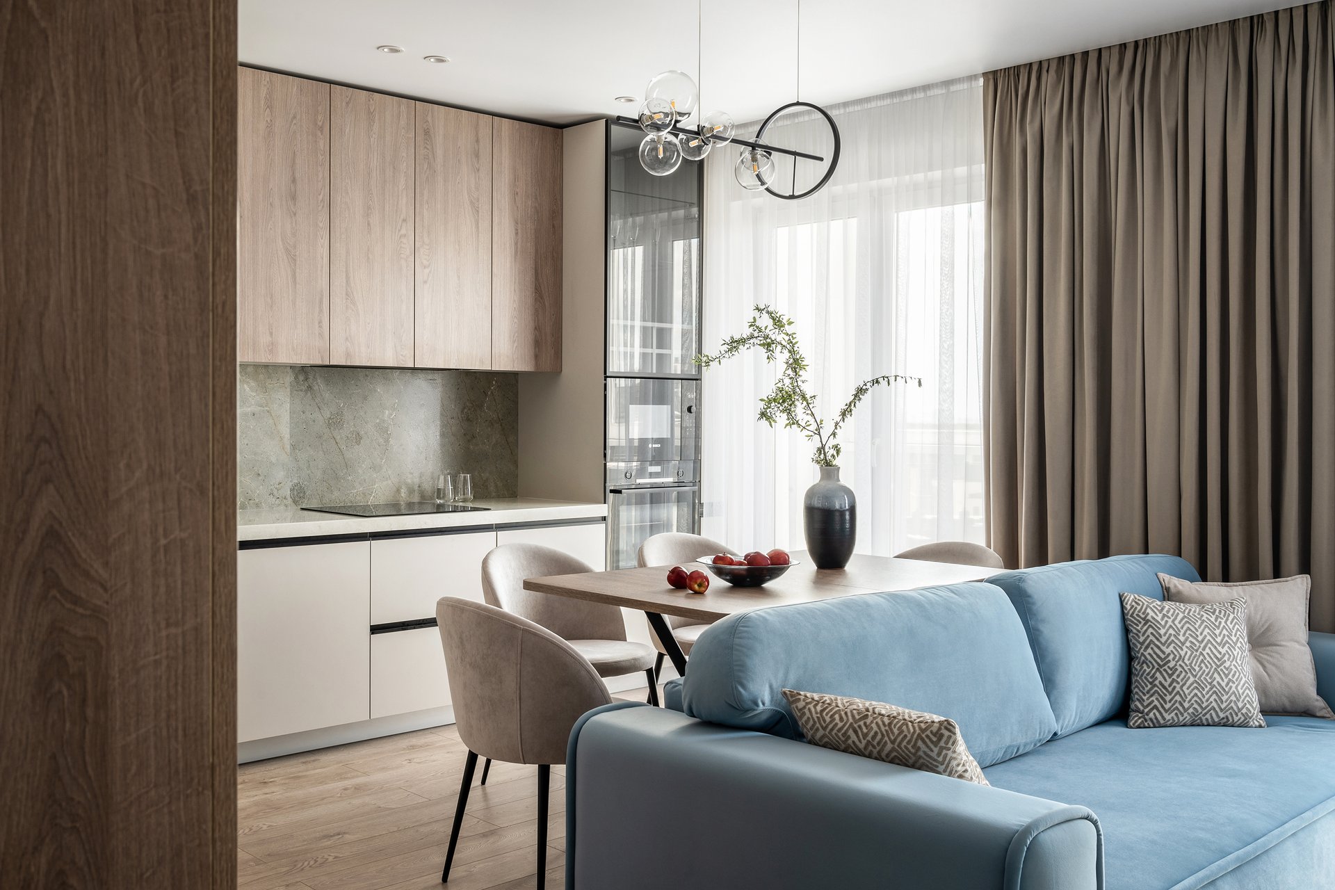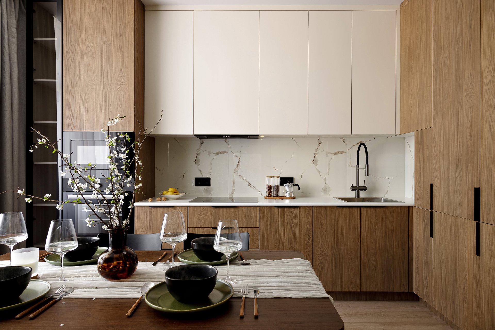 Отвечают за тактильность и глубину восприятия. И здесь основной принцип — натуральность + практичность. Массив в таком дизайне мирно соседствует с ламинатом или МДФ. А мрамор и гранит — с аналогом из кварцевого агломерата.