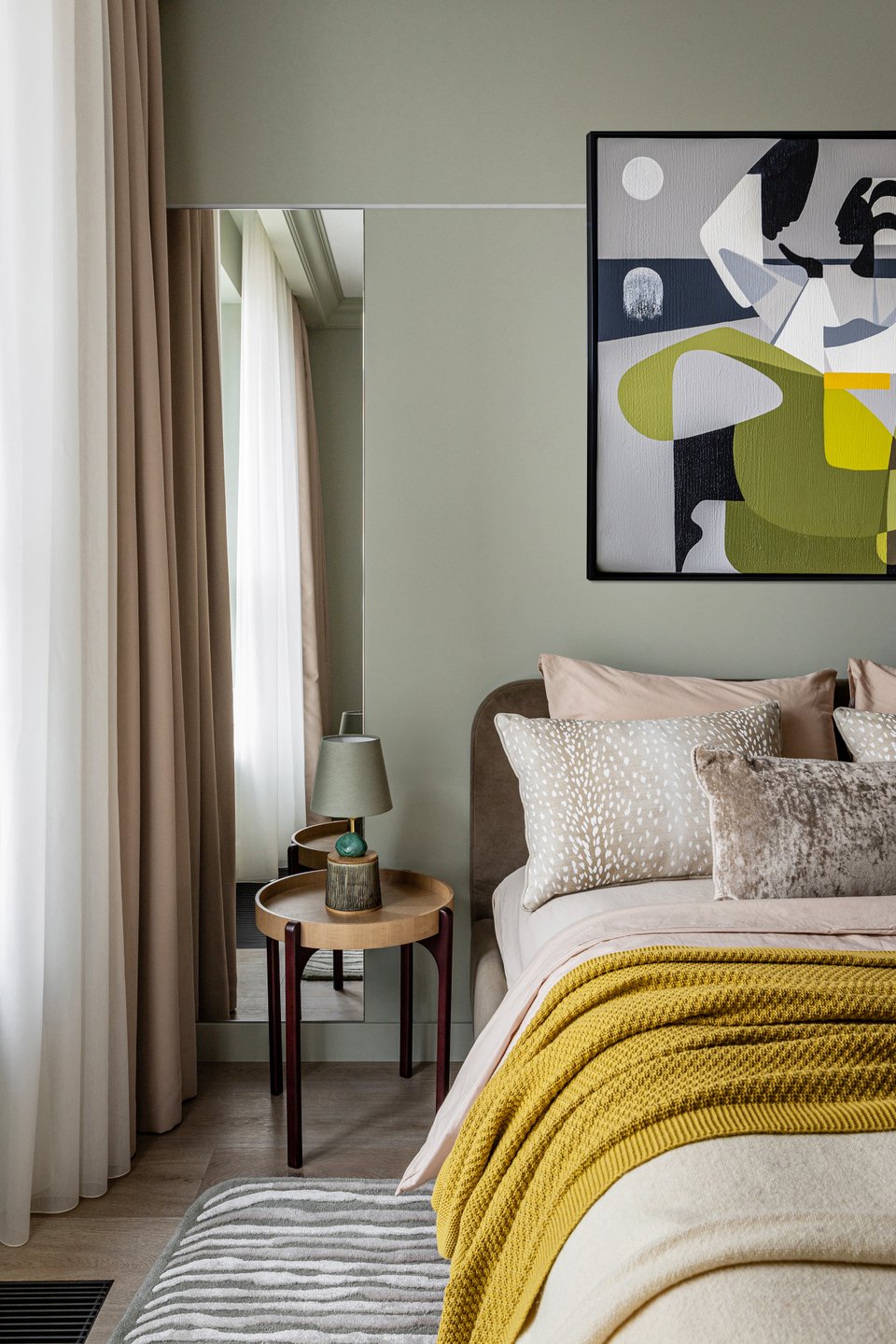 - На фото 4: двушка 70,4 кв.м, ЖК «Зенит». В кадре кровать Фостер 160. Дизайнер: Марина Кириллова; декоратор: Екатерина Шульц; фотограф: Юрий Прокофьев