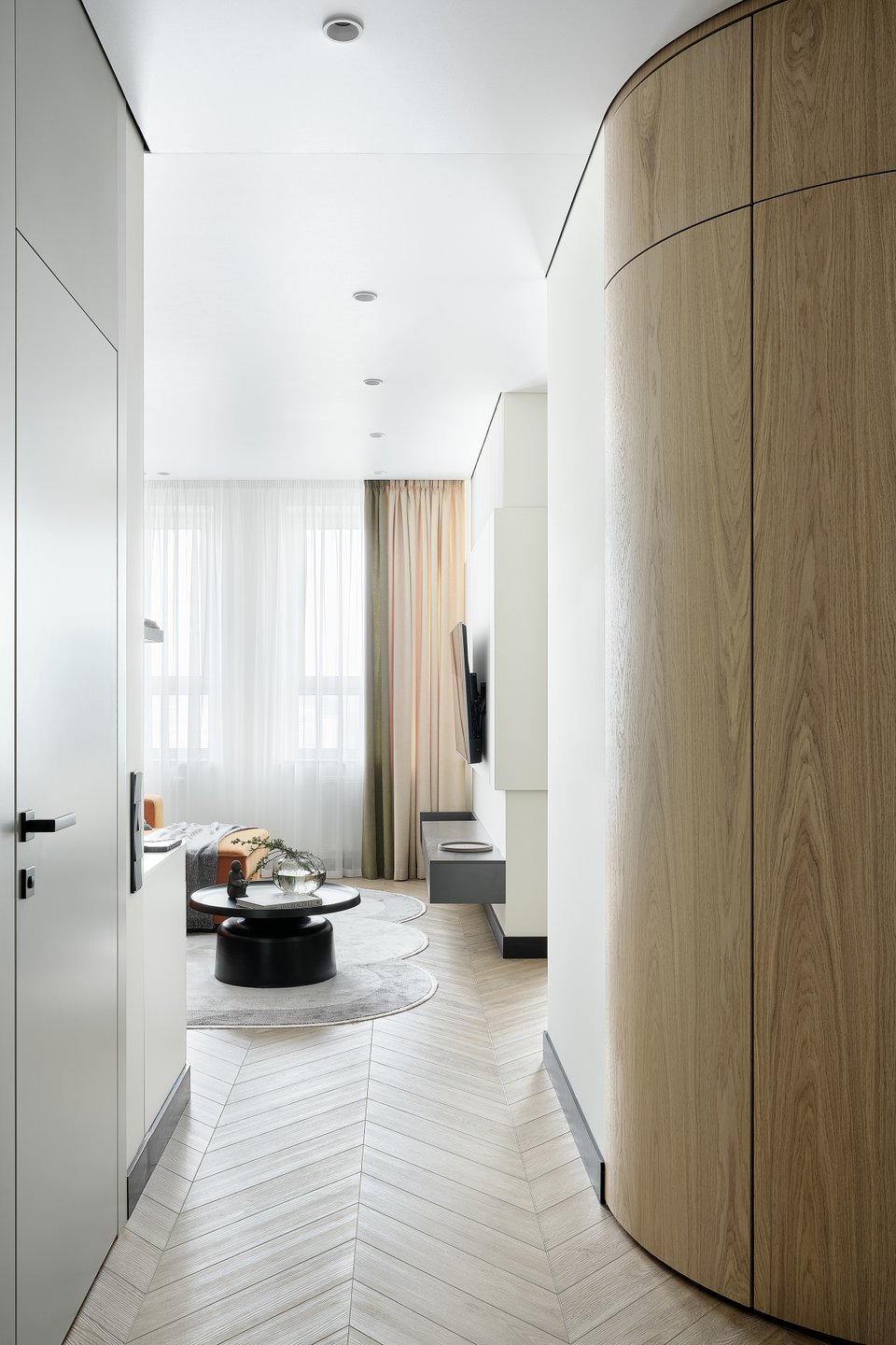 Безусловная функциональность. Каждый предмет полезен и играет понятную роль. Встроенные системы хранения, трансформирующаяся мебель и технологичные решения, не нарушающие эстетику интерьера.