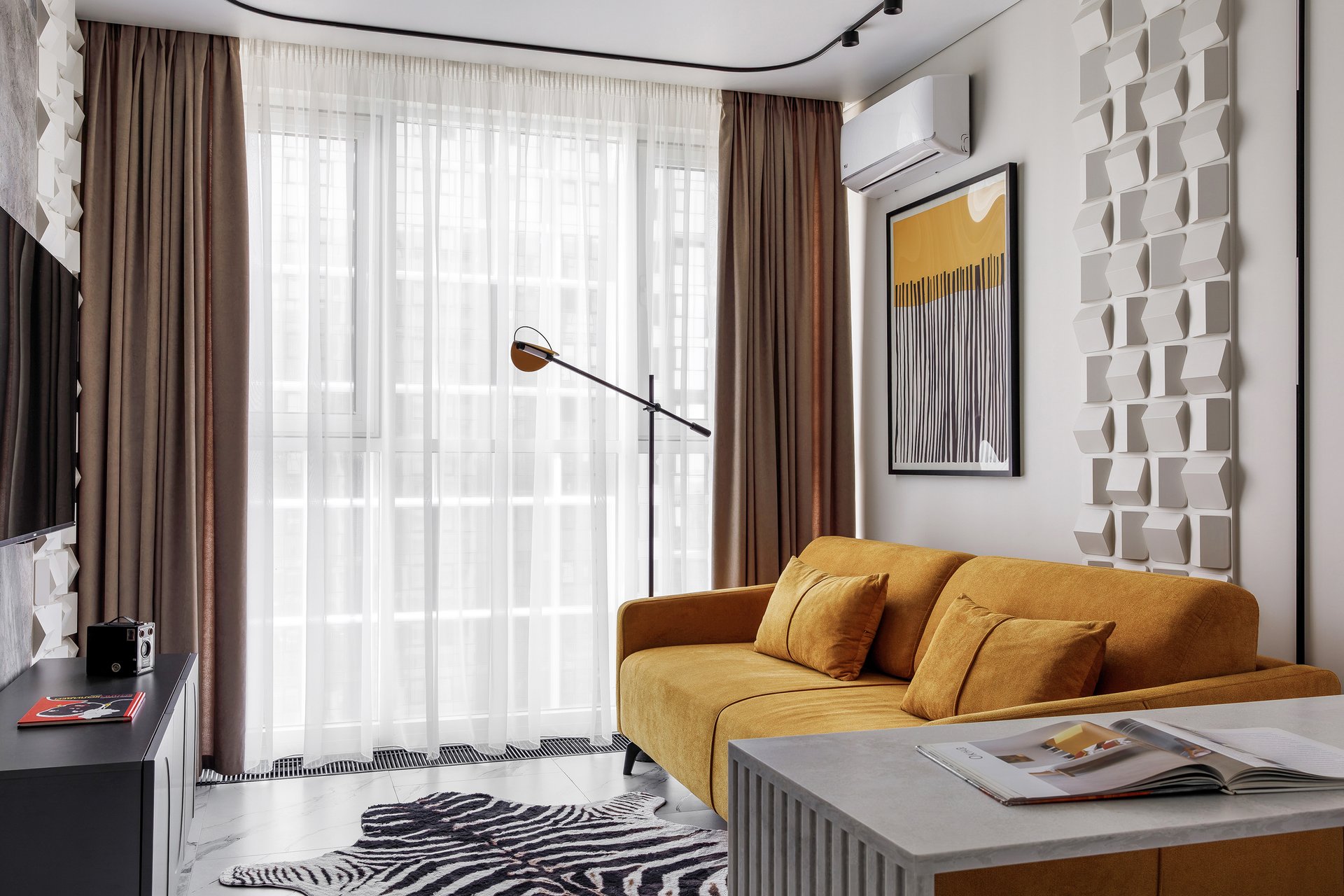 - Секрет удобства и эстетики — не в количестве декора, а в игре фактур. Грубый бетон и мягкий бархат, холодный камень и теплая шерсть, глянец и матовые поверхности создают ту самую глубину и тактильность по-настоящему уютной комнаты.