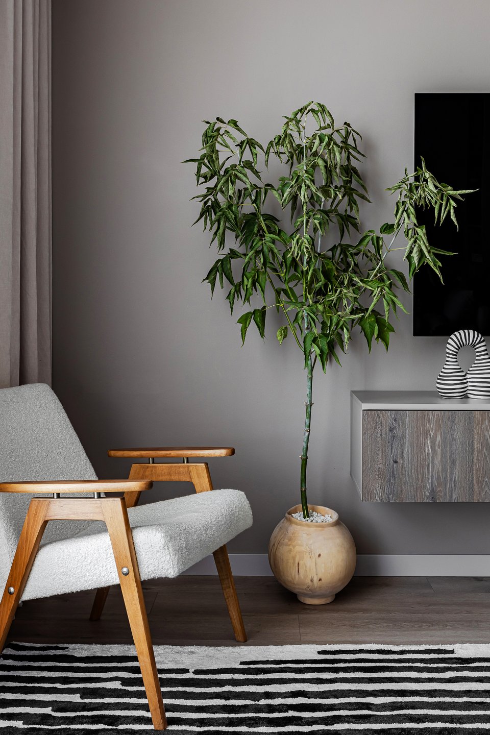 - живая зелень. Крупные кадочные растения — фикус лирата, монстера, олива или строгие композиции в кашпо — сделают современный интерьер более натуральным и экологичным;