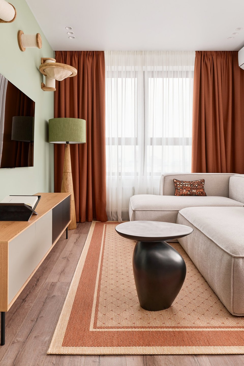 Только грамотный подход к обустройству эклектичного пространства сделает его действительно красивым и удобным. На фото: однушка 37,5 кв.м, ЖК «Первый квартал». В кадре тумба Воямполь и ковер двусторонний Сантия — все от divan.ru. Дизайнер: Анна Савина; фотограф: Рита Низамова