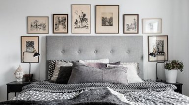 Динамичную композицию можно создать с помощью картин разных форматов. Начните с самой большой картины (одной или двух), затем разместите картины поменьше и в конце заполните пустые места самыми маленькими работами. Такой способ позволяет пополнять вашу галерею без необходимости перевешивать картины.