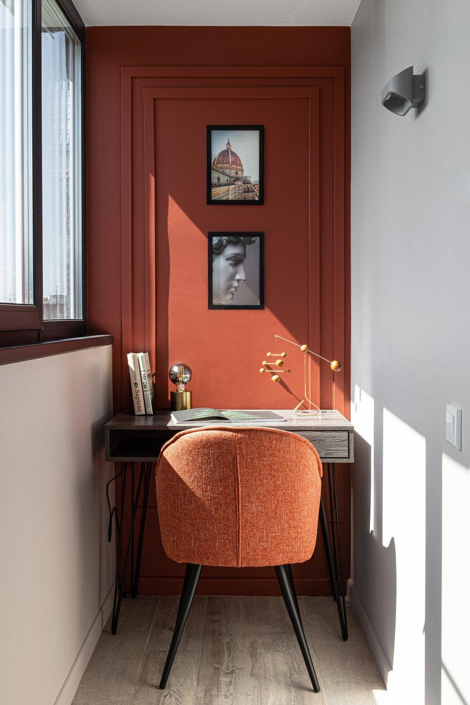 Из гостиной есть выход на лоджию. Ее застеклили и утеплили, предусмотрев электрический теплый пол. Здесь обустроили рабочий кабинет.