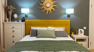 Хозяевам хотелось создать эффектный интерьер, но бюджет был ограничен. Концепция супрематизма родилась неожиданно, когда было решено соединить красную кухню, синюю кровать и желтый пуф рядом с диваном.