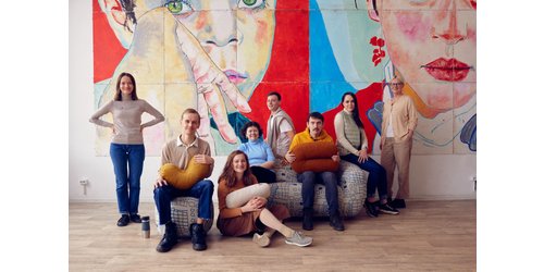 На фотографии (слева направо): Ирина Матвеева, мастер швейной мастерской фонда; Сергей Тиснек, студент фонда, художник; Елена Фильберт, директор фонда «Антон тут рядом»; Элизабет Лукьянова, студентка швейной мастерской; Павел Потехин, тьютор; Алексей Алферьев, автор принта коллекции, студент фонда; Яна Лютаревич, маркетинг-директор Диван.ру, Анна Кирик, директор по ассортименту Диван.ру