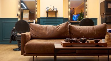 На антресольном этаже мы обустроили мини-кухню и лаунж-зону с диванчиком и креслами. Здесь проводятся мастер-классы и творческие встречи.