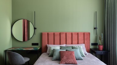 Спальную зону обустроили таким образом, чтобы ее не было видно из прихожей, несмотря на отсутствие межкомнатной двери. Кровать с мягким изголовьем благородного серого оттенка — от Диван.ру.