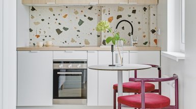 В обеденной зоне разместили круглый стол и стулья в яркой обивке, в зоне отдыха — компактный диван нейтрального бежевого оттенка.