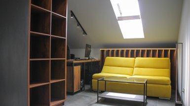 — Парадоксально, но квартира с голыми бетонными стенами выглядит женственной и уютной, — подводят итог дизайнеры. — Две стены, окрашенные в теплый белый цвет, дерево, шторы пудрового оттенка сбалансировали строгость бетона, эффект усилила яркая мебель. Аксессуары и постеры Маши Сомик и Вари Щука стали эффектными акцентами, а возможность менять сценарии освещения сделала обстановку динамичной.