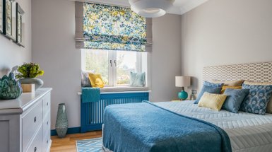 Можно использовать разные оттенки одного цвета. В качестве акцентного используют фиолетовый, насыщенный синий, терракотовый, ореховый и черный тона. В мужской спальне можно добавить коричневый, серебристый, дымчатый, в женской — красный, розовый, желтый тона.