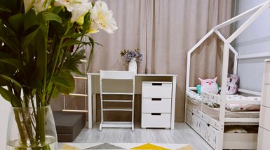 Единственная комната, где мы вообще не рассматривали мебель из ИКЕА, как бы мы ее ни любили. Здесь хотелось чего-то добротного, тяжелого, натурального и визуально незатасканного. В итоге на просторах соцсетей нашли производство детской мебели: именно такой, какой нам хотелось: элементы натурального дерева, фасады из МДФ и все тактильно очень приятное.