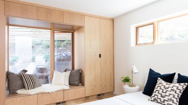 Если на лоджии места достаточно, можно встроить угловой шкаф, П-образную конструкцию или даже трапециевидную, с небольшим сидением у окна.