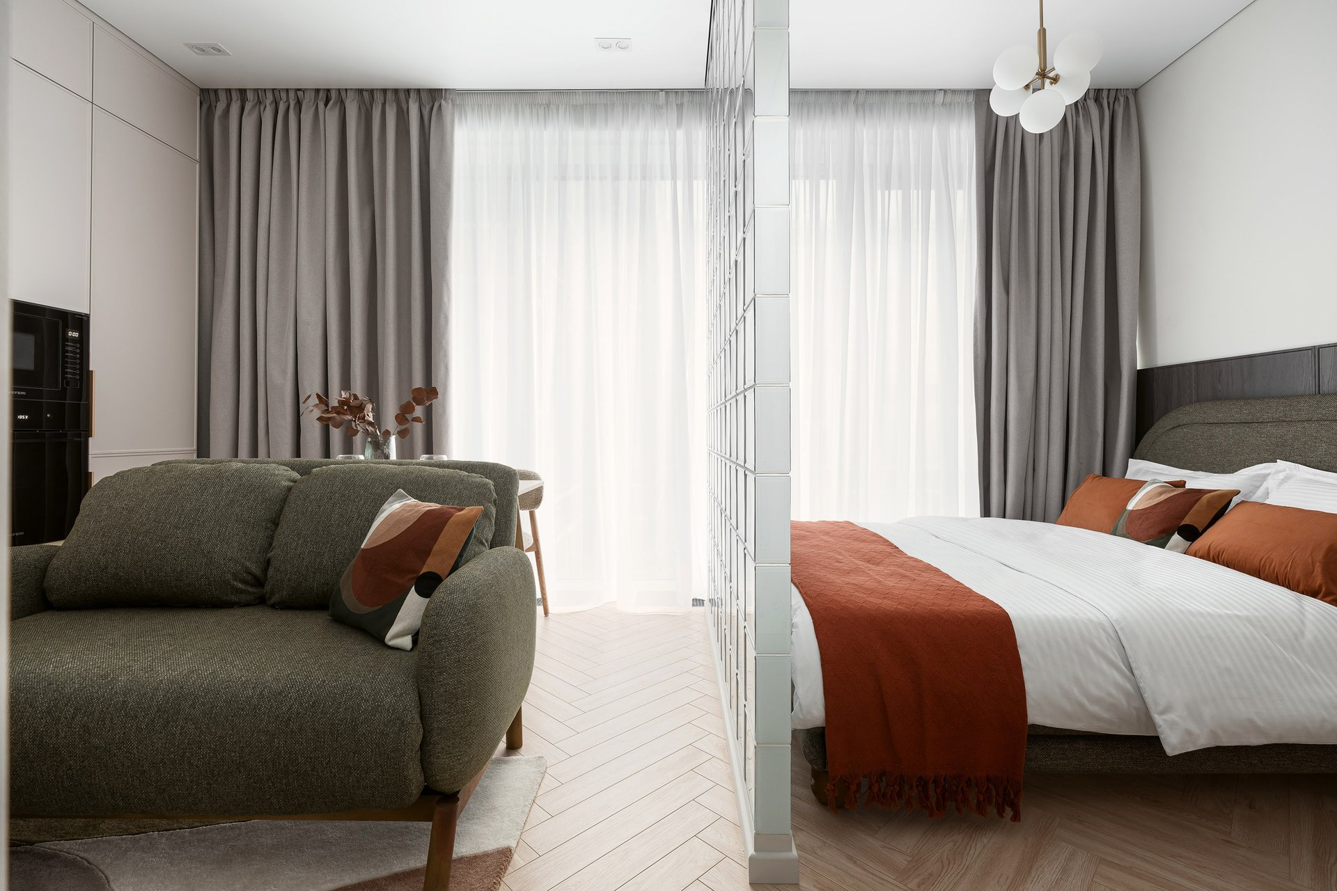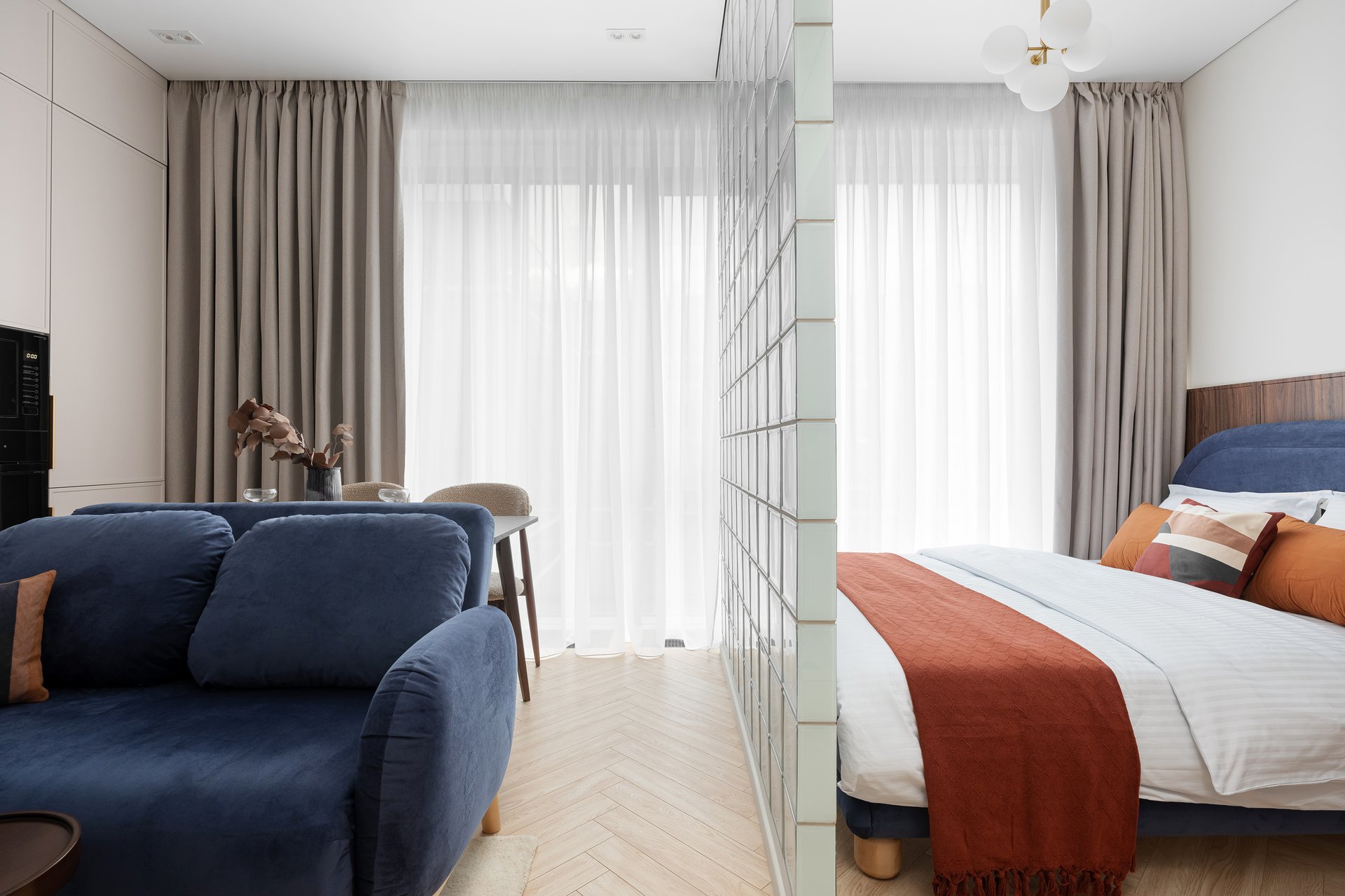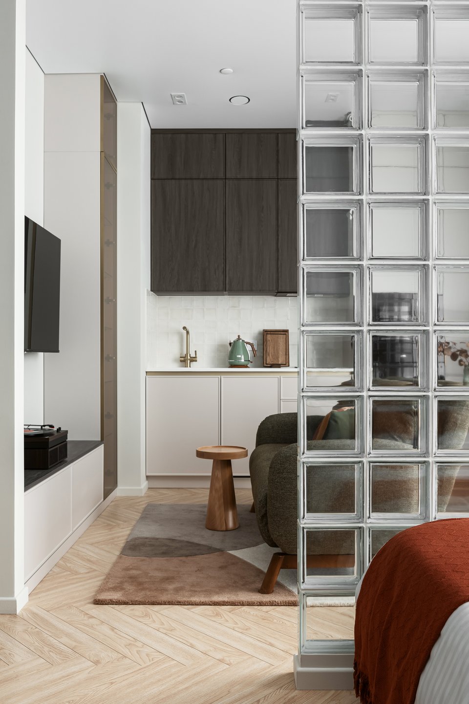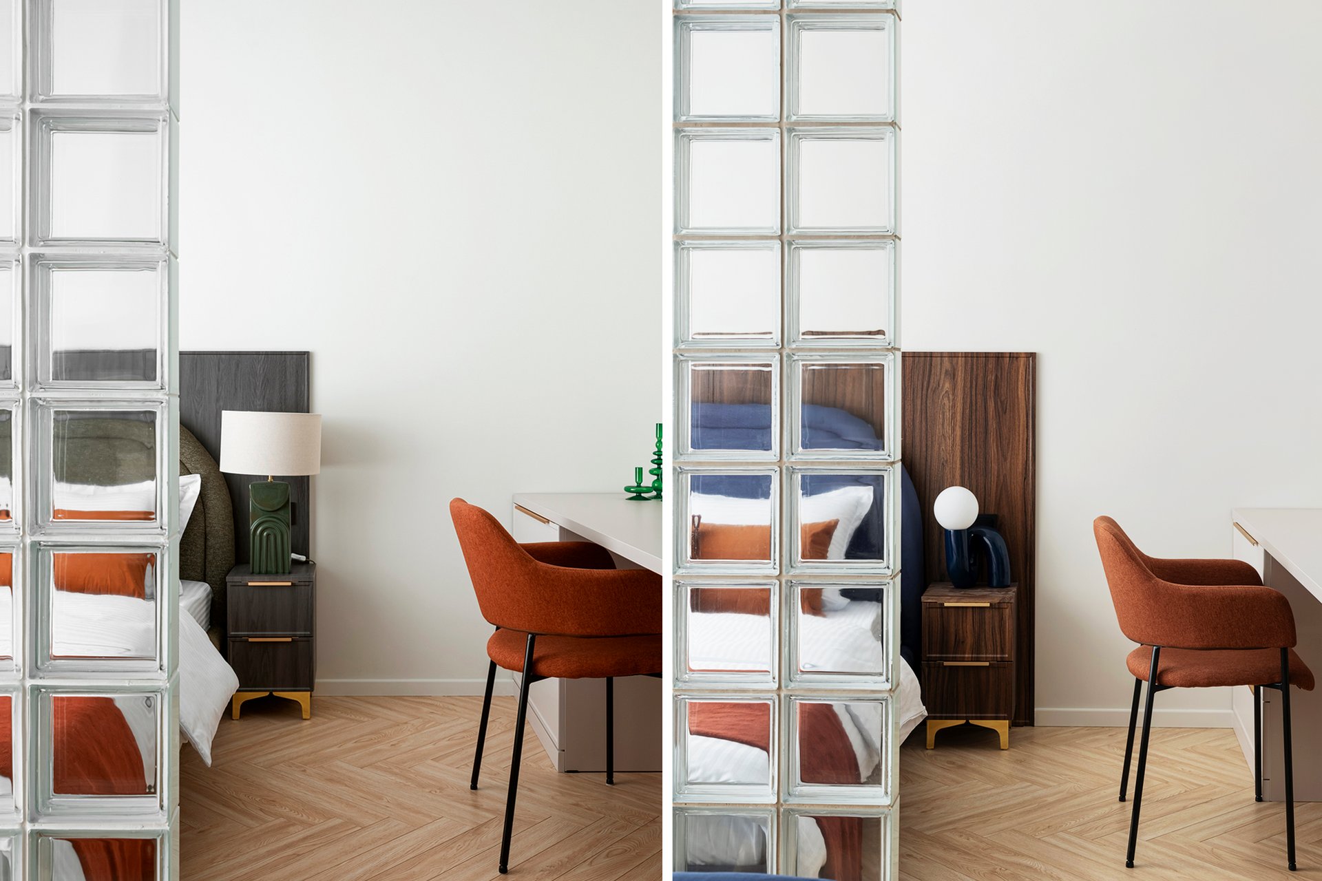 Проблема и решение: чтобы объекты оставались ликвидными и конкурентоспособными на рынке недвижимости, было важно предоставить арендаторам все необходимые зоны для комфортной жизни. Однако превратить студии в полноценные однокомнатные квартиры было невозможно из-за конфигурации помещений. Было принято решение зонировать их нестандартным образом — с помощью перегородок из стеклоблоков. Такой способ зонирования поддерживает концепцию ретро и позволяет сохранить ощущение открытого пространства в квартирах.