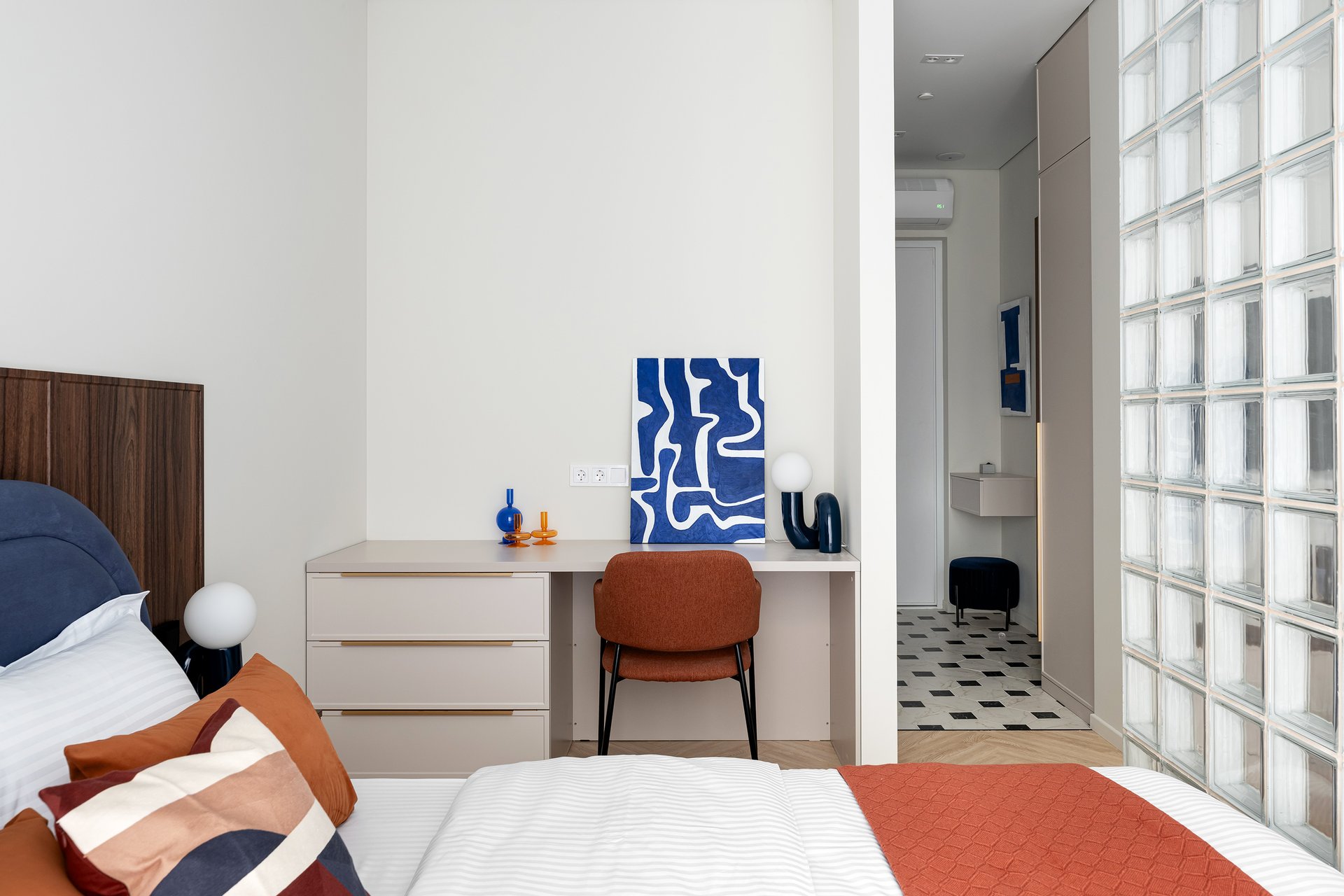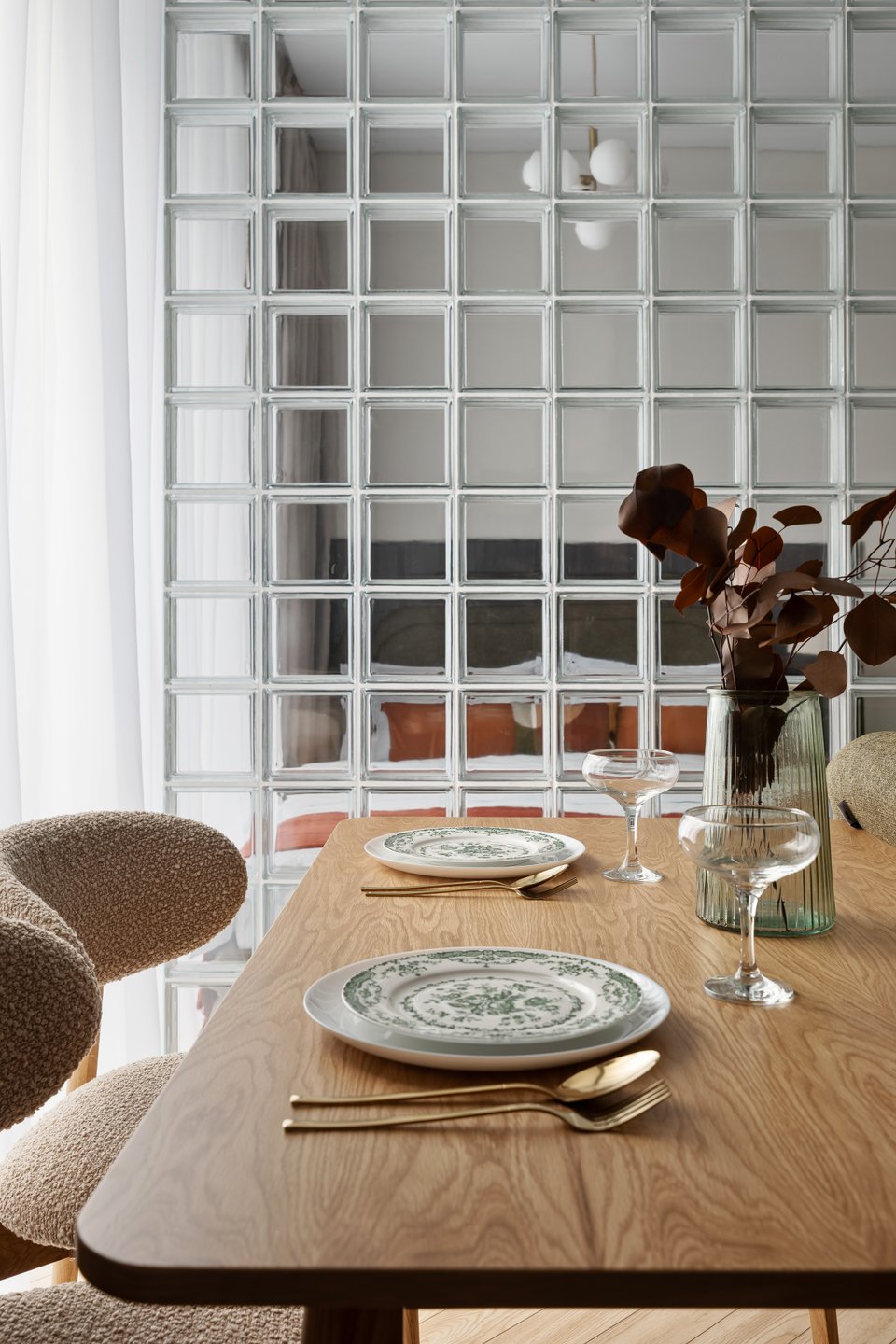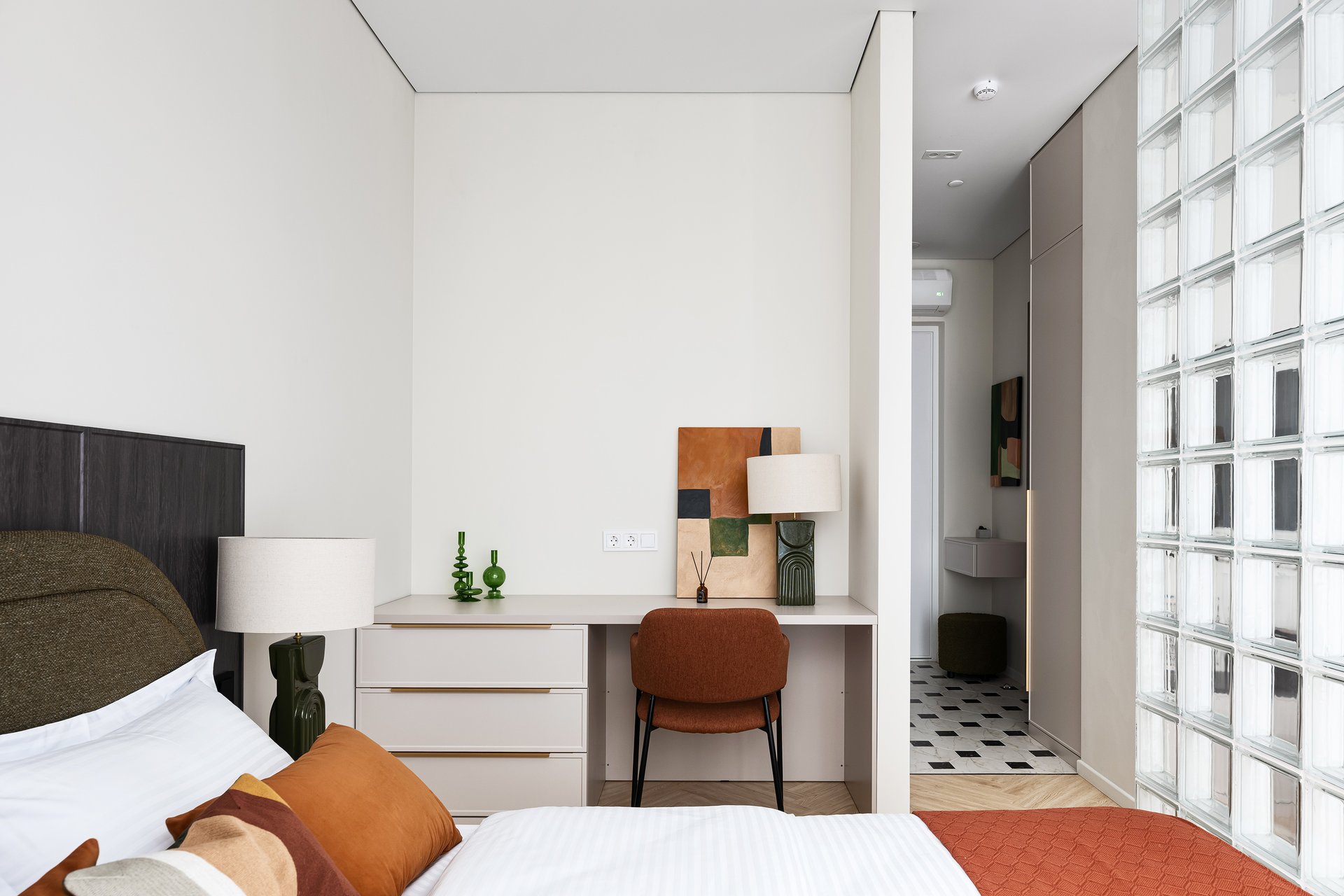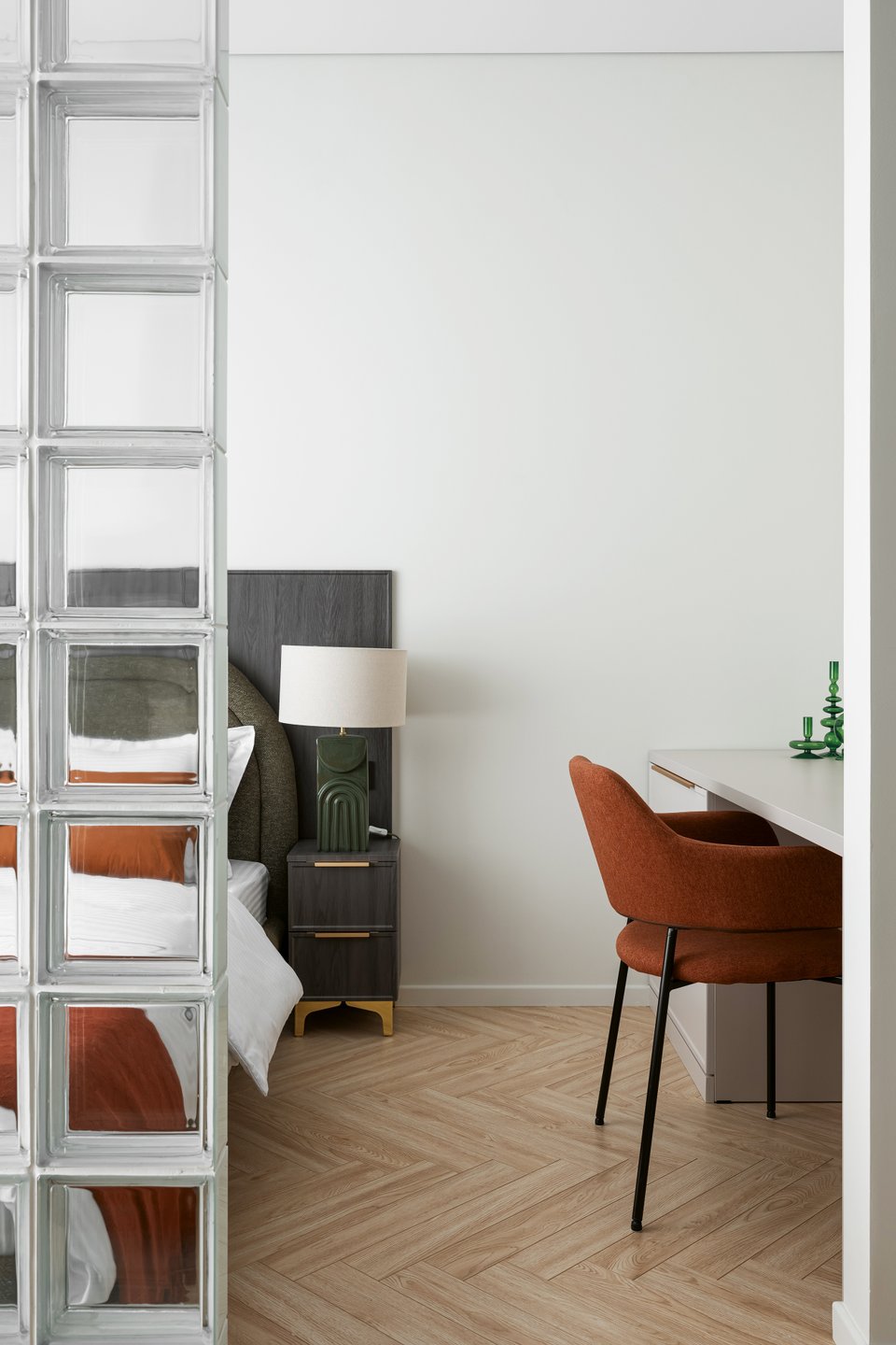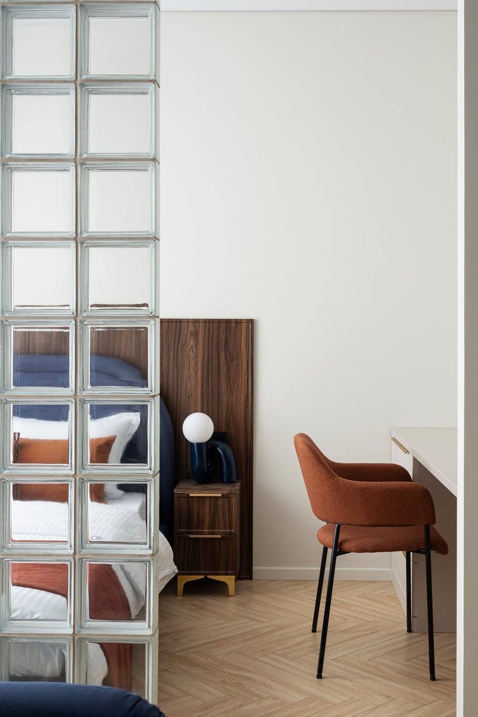Проблема и решение: чтобы объекты оставались ликвидными и конкурентоспособными на рынке недвижимости, было важно предоставить арендаторам все необходимые зоны для комфортной жизни. Однако превратить студии в полноценные однокомнатные квартиры было невозможно из-за конфигурации помещений. Было принято решение зонировать их нестандартным образом — с помощью перегородок из стеклоблоков. Такой способ зонирования поддерживает концепцию ретро и позволяет сохранить ощущение открытого пространства в квартирах.