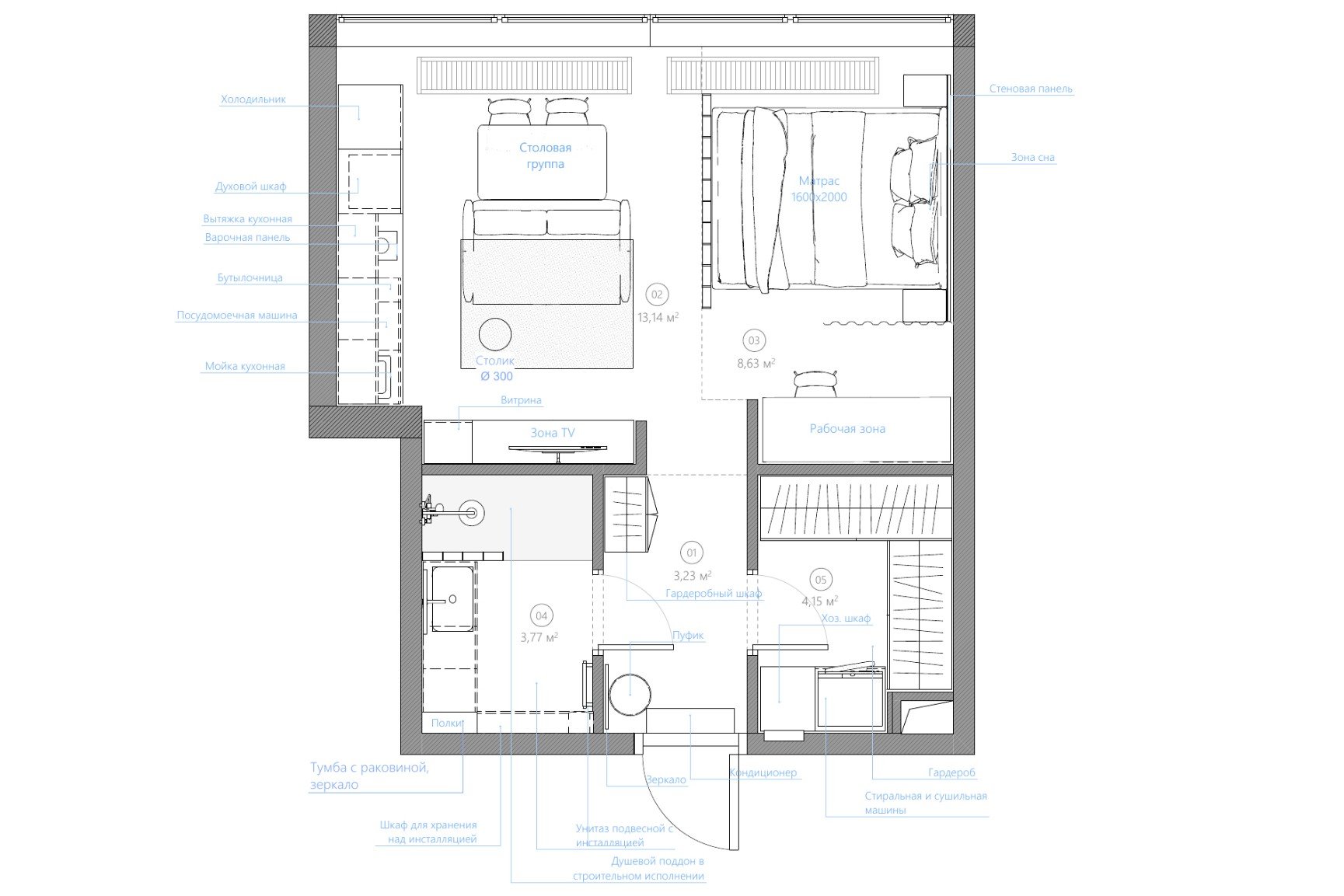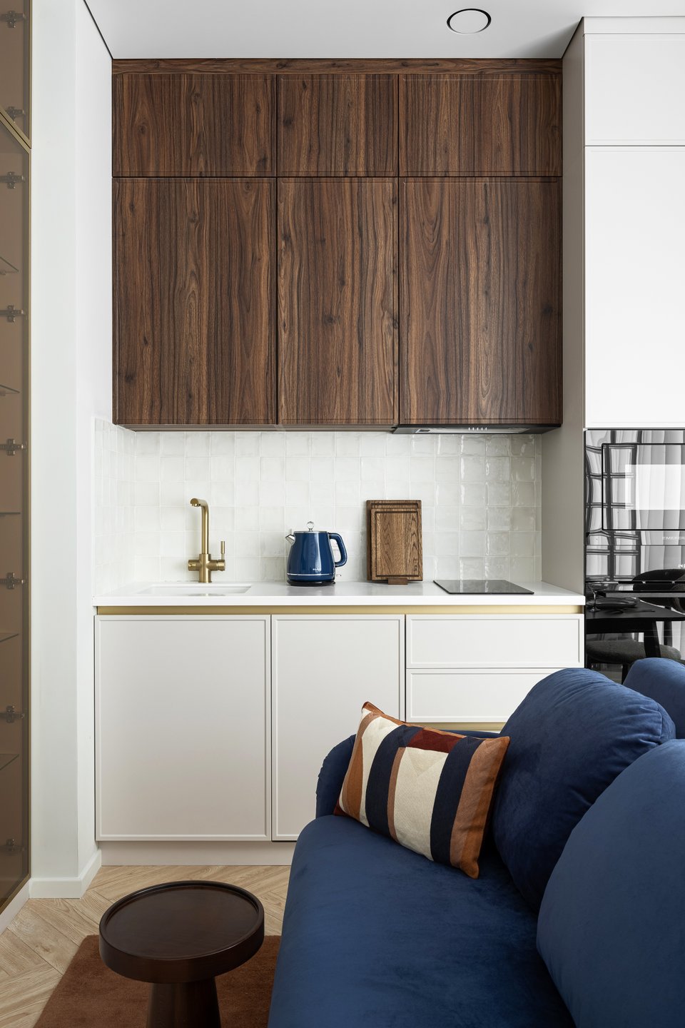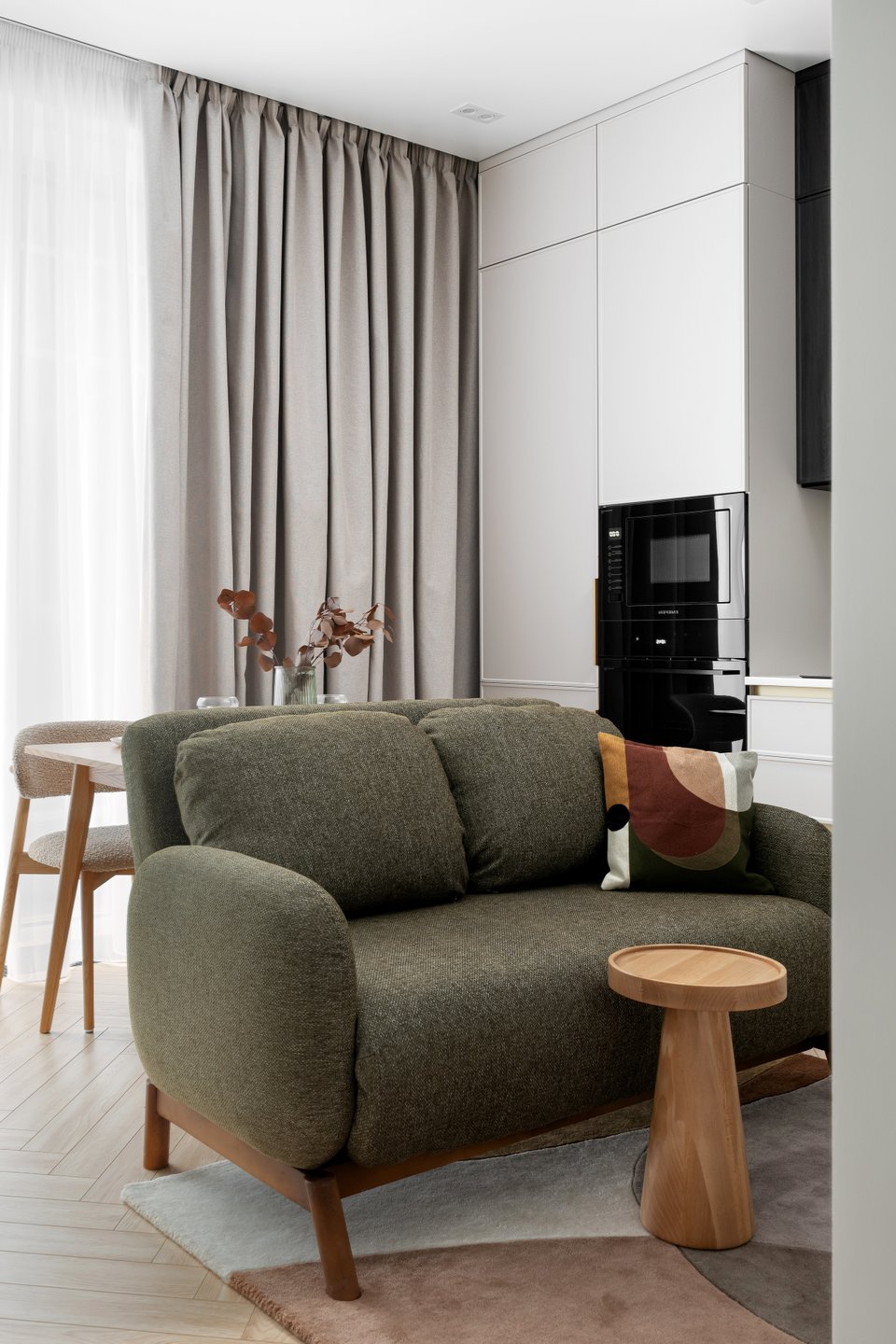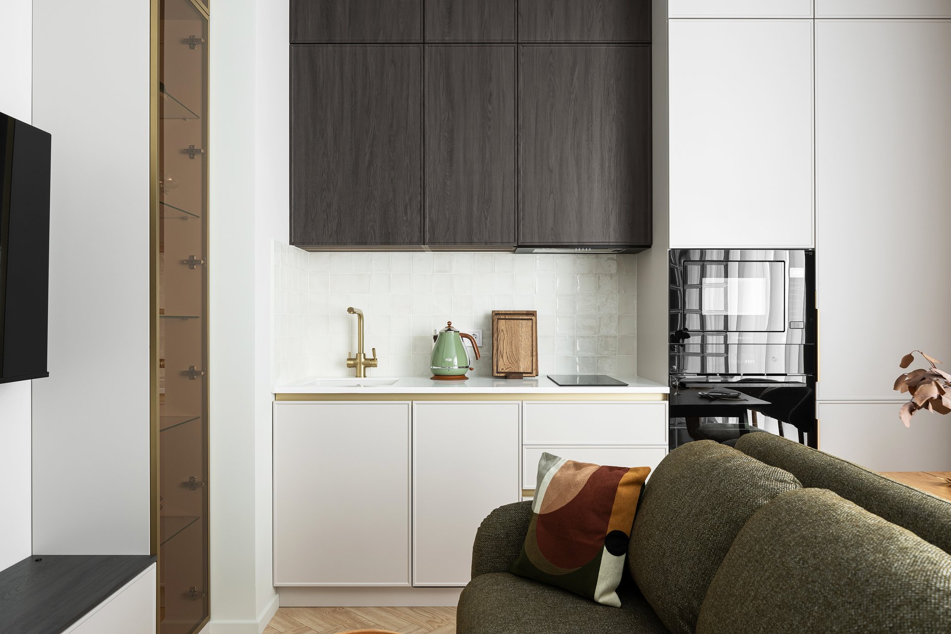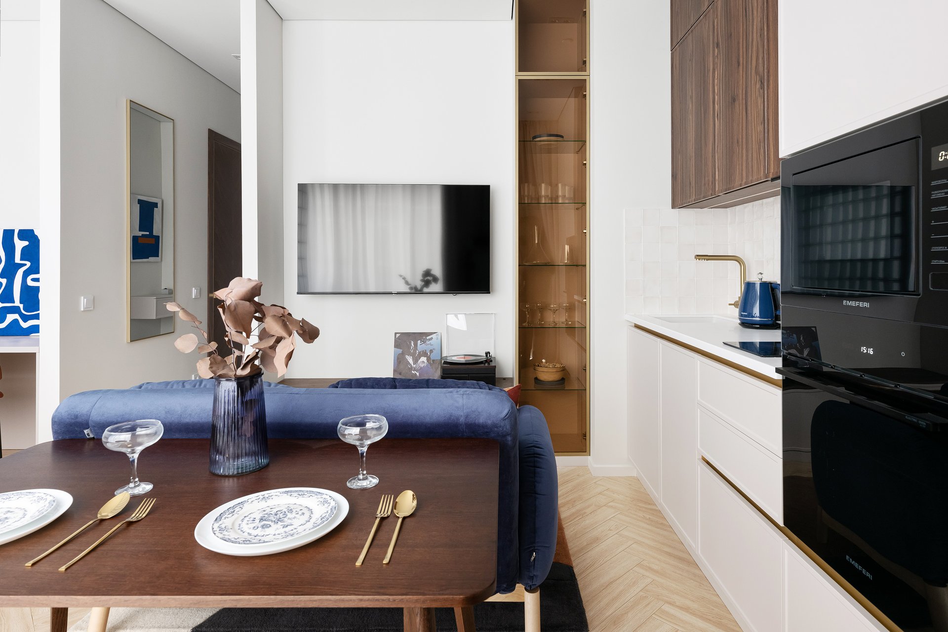 «Когда мы получили план от застройщика, стало ясно, что зону кухни-гостиной стоит скорректировать, — рассказывают дизайнеры. — Изначально застройщик запланировал здесь угловую кухню, но на такой маленькой площади это выглядело бы избыточно. Мы решили, что важнее добавить зону отдыха. Стену немного выдвинули вперед и тем самым создали нишу для витрины и ТВ-тумбы. Напротив поставили диван, вплотную к нему — обеденную группу. Так мы максимально эффективно использовали пространство: разместили все необходимое и сохранили баланс между кухней и гостиной».