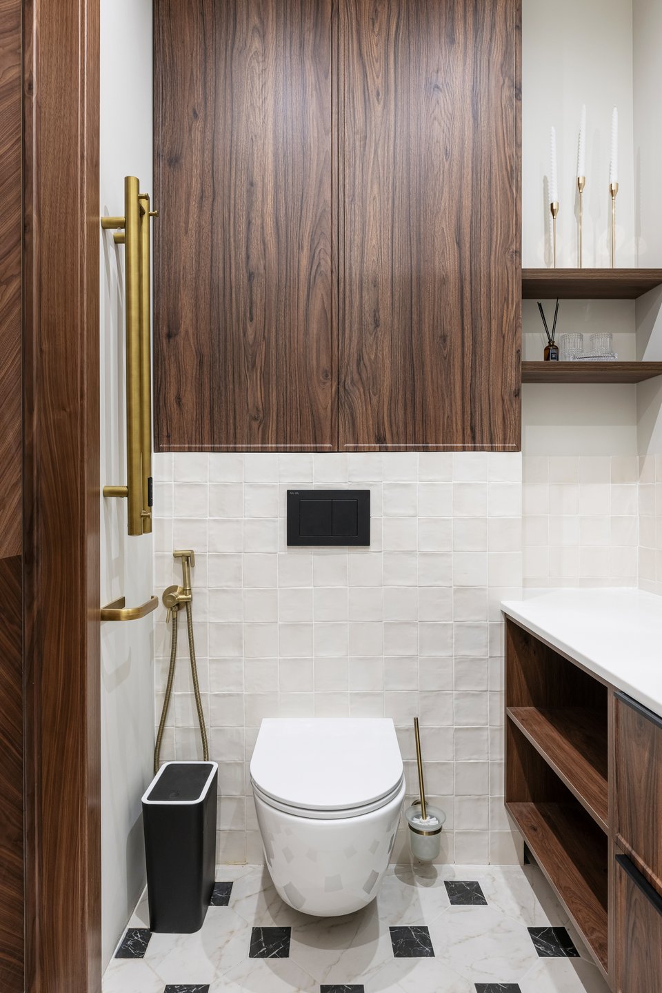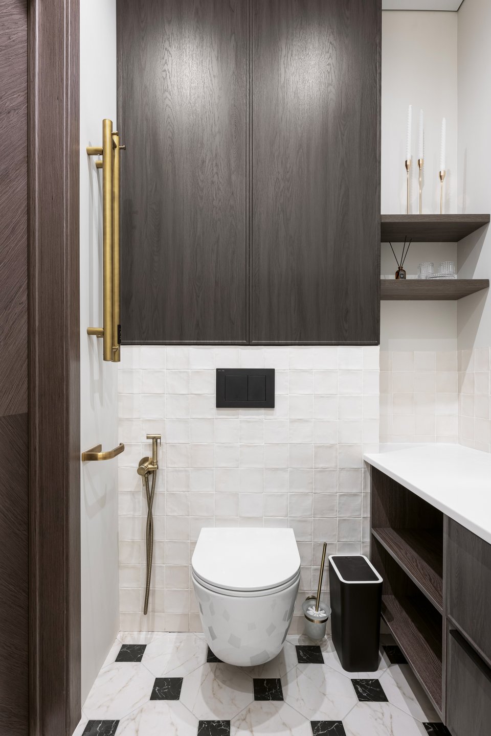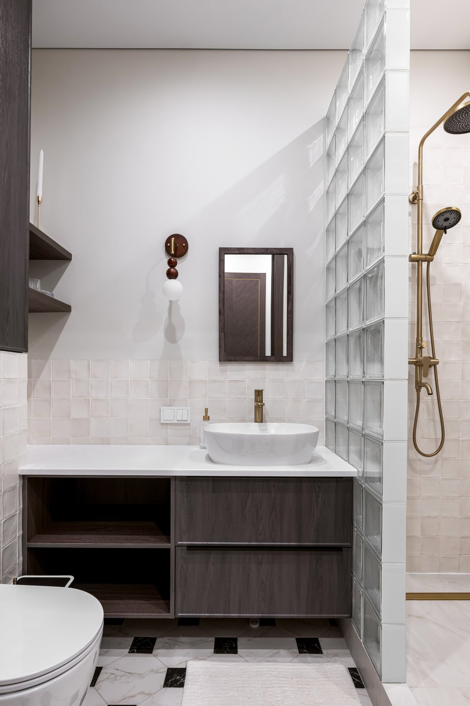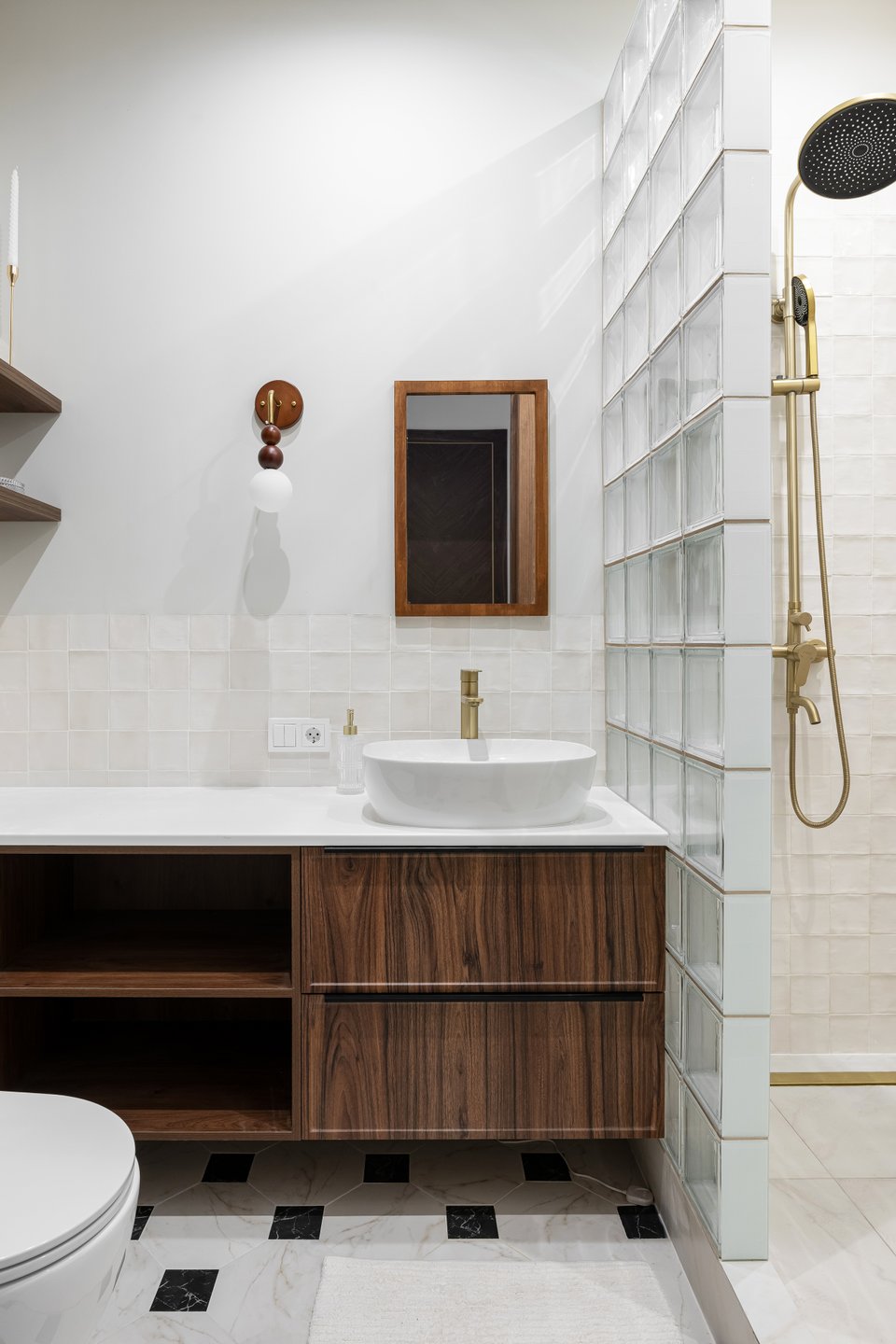 В санузлах одинаковая отделка и мебель, отличается только цвет дерева. На полу та же плитка, что и в прихожей, в душевой — керамогранит под мрамор без черных вставок. Стены отделали плиткой в мокрых зонах, остальные поверхности покрыли краской для влажных помещений. Душевую от остального пространства отгородили стеклоблоками. Все столярные изделия выполнены на заказ.