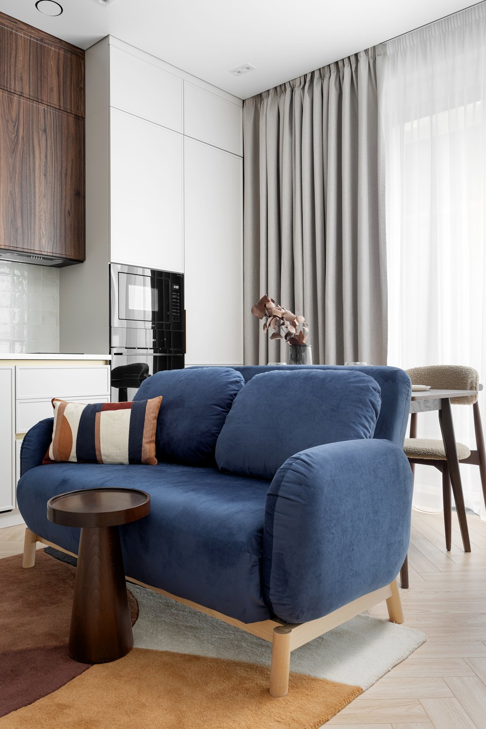В квартире с синими акцентами стоит диван Массе-М Мини Navy Blue и журнальный стол Джейми Brown, в «зеленой» квартире — диван Массе-М Мини Olive и журнальный стол Джейми Wood.