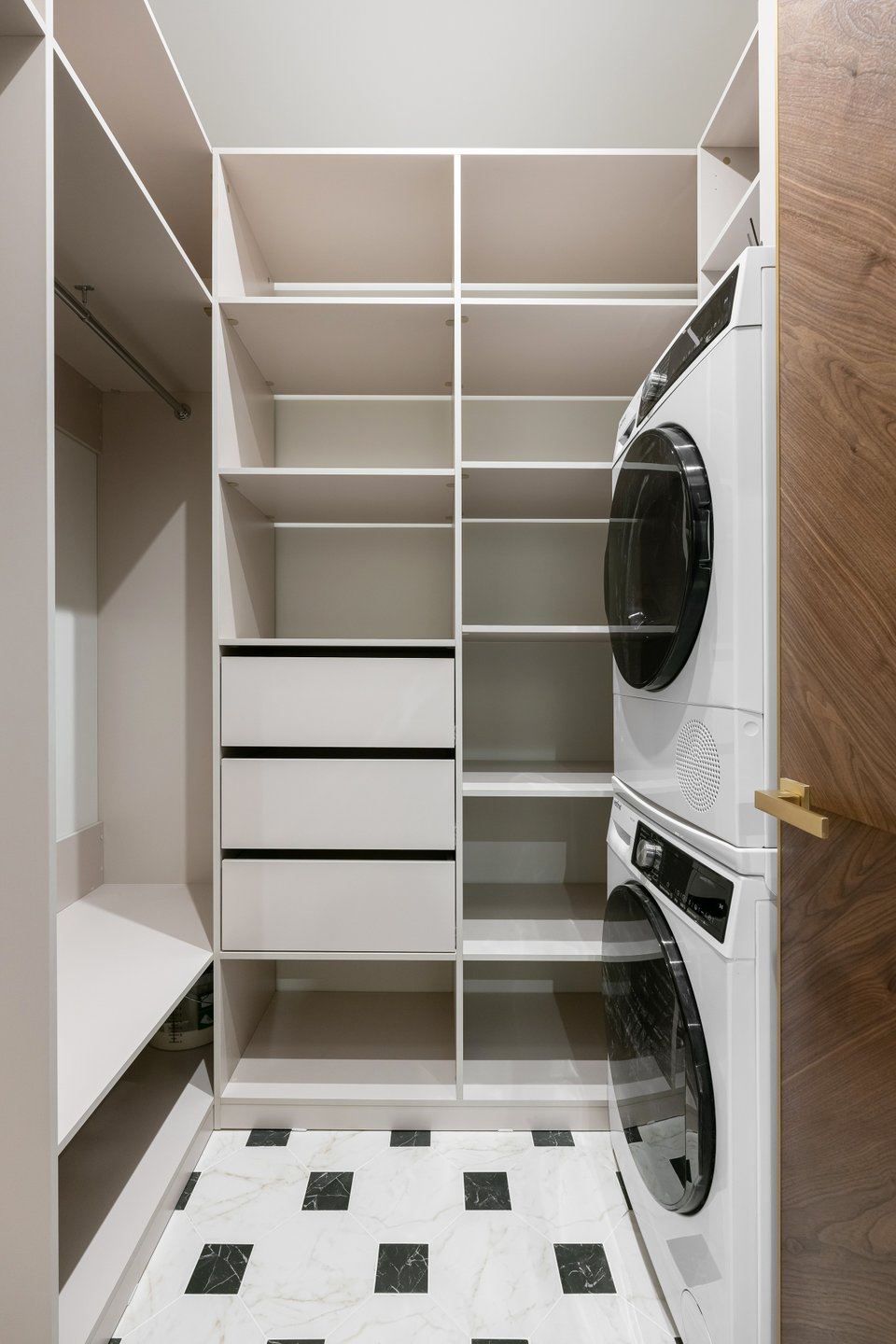 Рядом расположена гардеробная с системой хранения из ЛДСП. В ней нашлось место и для колонны со стиральной и сушильной машинами.