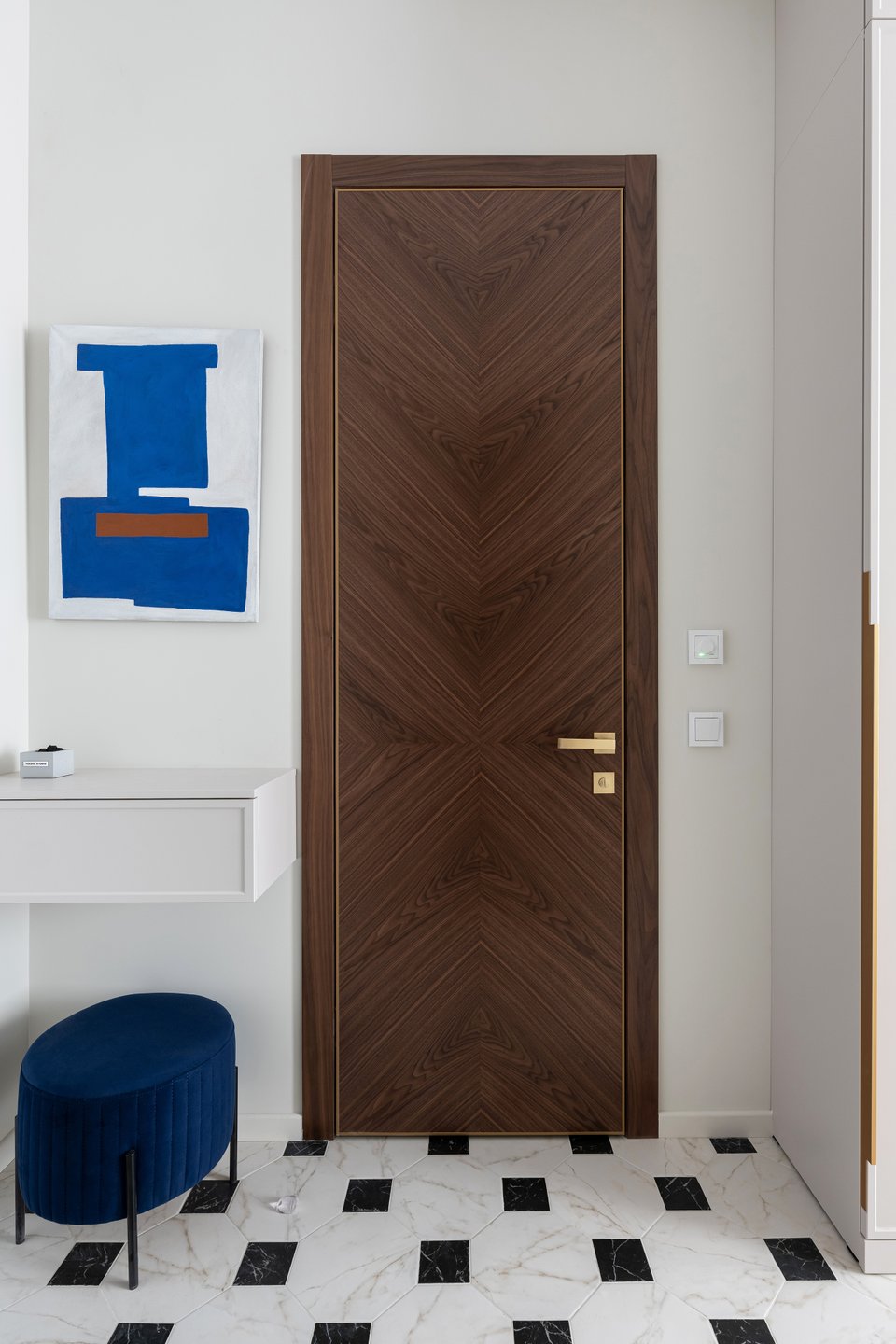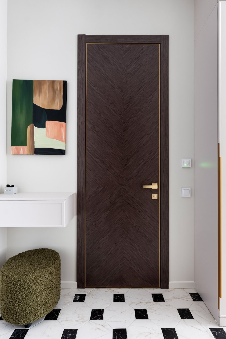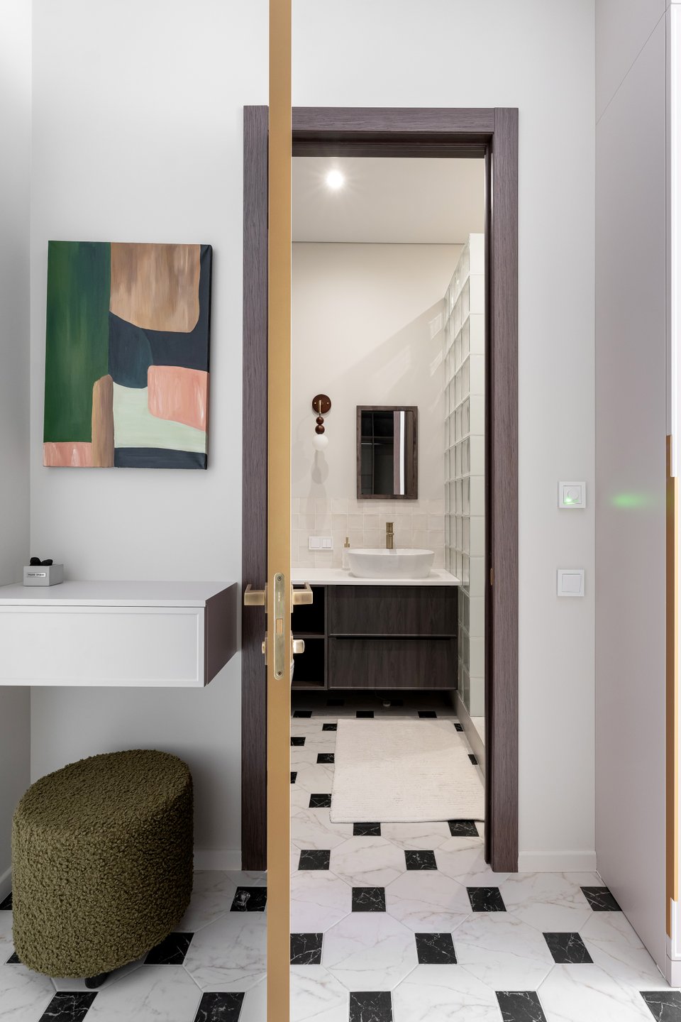 На полу в прихожей — узор из черного и белого керамогранита, стены покрыты той же краской, что и во всей квартире. Для мелочей предусмотрели подвесную тумбу при входе. Различия только в оттенке дверей, пуфов и картин над тумбой.