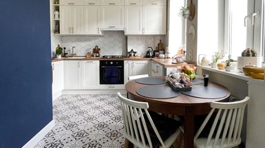 Площадь кухни 11,5 кв. м. Здесь нашлось место и посудомоечной, и стиральной машине. Кухонный фартук изначально установили стеклянный, но впоследствии на обоях под фартуком стали заметны стыки, появились чёрные точки, а на самом стекле — разводы, которые не отмывались. На одной стене заменили фартук гипсовым кирпичиком, покрасили белой краской и покрыли матовым лаком, вторую стену оформили штукатуркой.
