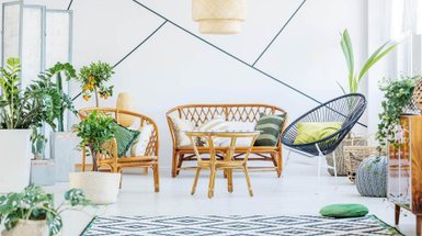 В ландшафтном дизайне гармонично смотрится деревянная мебель. Чтобы она сохранила первозданный вид надолго, ее 2-3 раза в год обрабатывают защитными составами. Не менее популярна и мебель из ротанга. Натуральный материал выгорает, боится влаги и мороза, для улицы больше подходит искусственный аналог — красивый и долговечный. Модельный ряд у такой мебели широкий. Интересно смотрятся в интерьере кресла с веревочным плетением, но лучше спрятать их в беседку или на террасу.