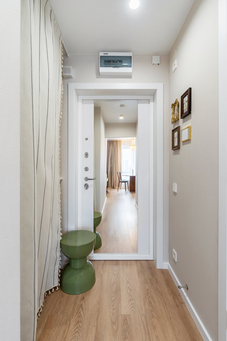 Стены в прихожей выкрасили в нейтральный оттенок, который переходит в остальное пространство и является базой, на которую наслаиваются остальные элементы декора и мебели. От застройщика досталась ниша для шкафа, но его в целях экономии ставить не стали. Как и в гардеробной, здесь использовали готовую систему хранения. Дополнили зону хранения пластиковым стулом акцентного оливкового цвета, полкой для мелочей и закрыли лаконичной шторой, которая висит на телескопической штанге для душа. Настроение квартире хотелось задать с самого порога, поэтому противоположную стену украсили декоративными рамками.