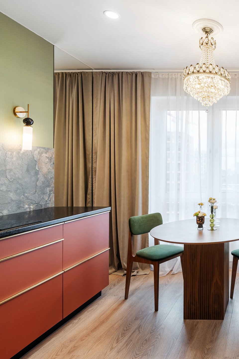 «Я бы назвала стилистику квартиры эклектикой, так как использовала приемы, присущие классическому стилю (обеденная группа из натурального дерева и шпона, черно-белый шахматный пол в санузле, насыщенный зеленый цвет на стенах), ретроэлементы в виде винтажной люстры и картины в стиле барокко», — комментирует автор проекта.