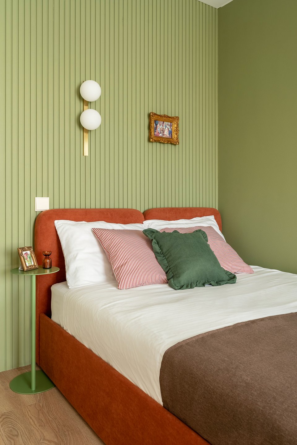 Кровать стоит достаточно плотно к двери и использовать прикроватную тумбу не было возможности, поэтому ее роль выполняет приставной столик из стали в цвет стен. Так как спальное место является само по себе ярким, за основу взяли базовое сатиновое постельное белье в полоску и уже на нем сделали акцент текстильным декором.