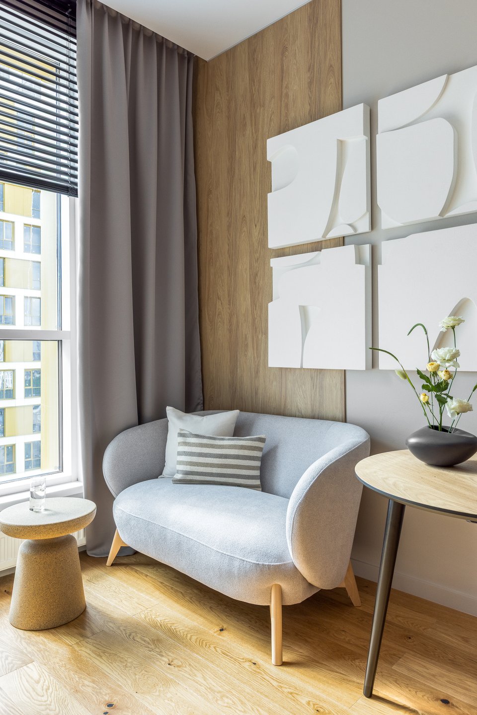 Интересное решение: на стене за диваном установлена декоративная панель Egger в цвете «гикори натуральный». Фактура и оттенок дерева стали объединяющим мотивом интерьера всей квартиры. Чтобы подчеркнуть индивидуальность проекта, на стену добавили сет из четырех авторских панно с мягкой геометрией.