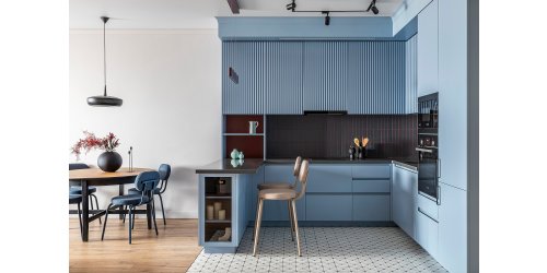 На контрасте с яркими тонами мягкий, но насыщенный оттенок мгновенно добавляет пространству глубины. На фото: интерьер квартиры 48 кв.м, ЖК «Балтийский». Дизайнер: Мила Генч; стилист: Ирина Темнова; фотограф: Андрей Орехов