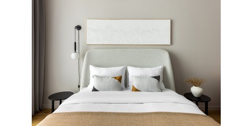 Центральным элементом спальни стала кровать Кевия от divan.ru в обивке «барашек» из букле. За изголовьем организовали полку на выступе из ГКЛ. По обеим сторонам от кровати расположили тумбы для личного хранения. Декор из макраме, а также фонарики вторят «балийскому вайбу».