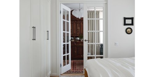 - Декор. Филенчатые фасады мебели, фрезеровка, на стенах и потолке лепнина — карнизы и молдинги. Все эти элементы добавляют пространству рельеф и глубину.