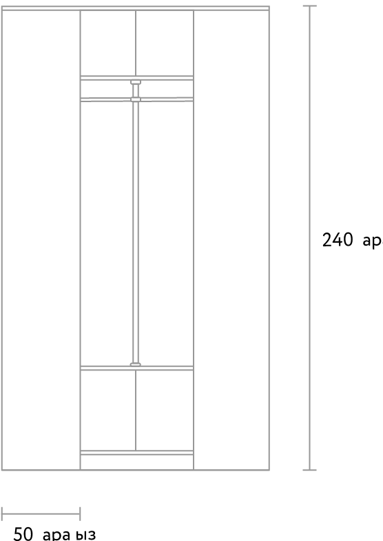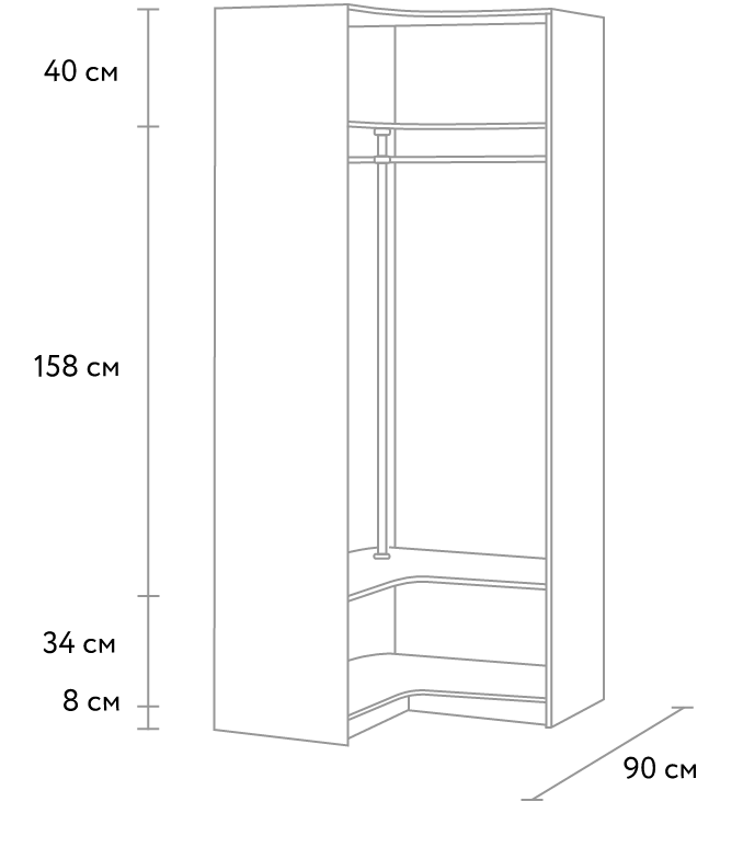 Deli-7 әмбебап модулі бұрыштық немесе U-тәрізді киім-кешек бөлмесін жобалау кезінде пайдалы. Құрылымның негізгі бөлігінде киім ілгіштерге арналған екі штанга бар. Жоғарғы жағында мезонин, төменгі жағында аяқ киім сөресі бар. Модуль 16 мм ламинатталған ДСП – дан, артқы қабырғасы бейтарап реңктегі ДВП-дан жасалған. Артқы қабырғадағы сол және оң бөліктердің жалпы ұзындығы бірдей мәнге ие және 90 см. Модульдің Ені 50 см, биіктігі 240 см.