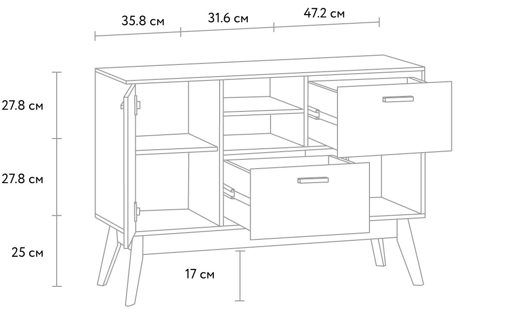 Қарапайым өлшемдерге қарамастан, "Нордик" өте кең. Дизайн екі тартпаны, бір бұралмалы және екі ашық бөлімді қамтиды. Оңай жұмыс істеу үшін қасбеттер тікбұрышты пішінді үстіңгі тұтқалармен жабдықталған.
