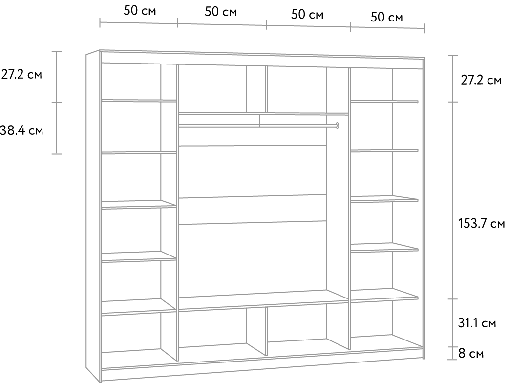 Төрт есікті "Тебар" шкафы-киімді ретке келтіруге ыңғайлы жүйе. Қатты өлшемдері мен жоғары сыйымдылығының арқасында ол үлкен отбасының гардеробын оңай орналастырады. Шкафтың дизайнында сөрелер мен штангалар бар, ал қасбеті үлкен айнамен безендірілген, онда сіз өзіңізді толық көлемде көре аласыз. Есіктердің артында сіз ойластырылған ішкі толтыруды күтесіз. Ал щетка таспасының болуы шкафтың ішіне шаңның түсуіне жол бермейді және қақпақтардың үнсіз ашылуын және жабылуын қамтамасыз етеді (бұл элемент өнімнің негізгі жиынтығына кірмейді және бөлек сатып алынады).