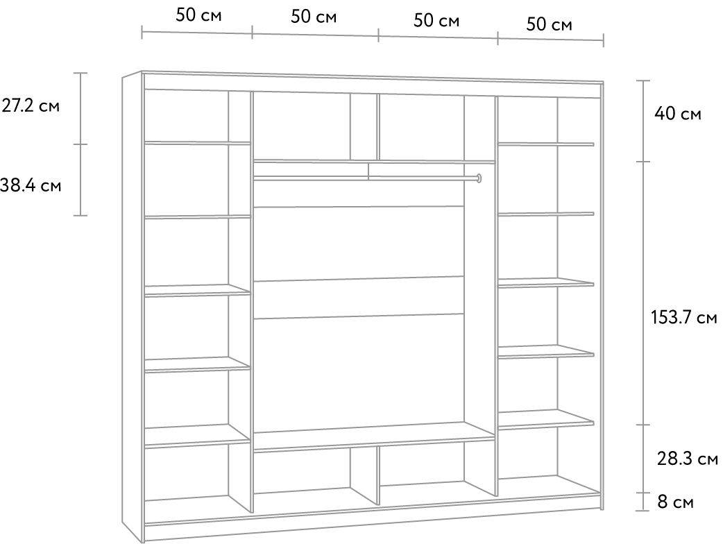 Төрт есікті "Тебар" шкафы-киімді ретке келтіруге ыңғайлы жүйе. Қатты өлшемдері мен жоғары сыйымдылығының арқасында ол үлкен отбасының гардеробын оңай орналастырады. Шкафтың дизайнында сөрелер мен штангалар бар, ал қасбеті үлкен айнамен безендірілген, онда сіз өзіңізді толық көлемде көре аласыз. Есіктердің артында сіз ойластырылған ішкі толтыруды күтесіз. Ал щетка таспасының болуы шкафтың ішіне шаңның түсуіне жол бермейді және қақпақтардың үнсіз ашылуын және жабылуын қамтамасыз етеді (бұл элемент өнімнің негізгі жиынтығына кірмейді және бөлек сатып алынады).
